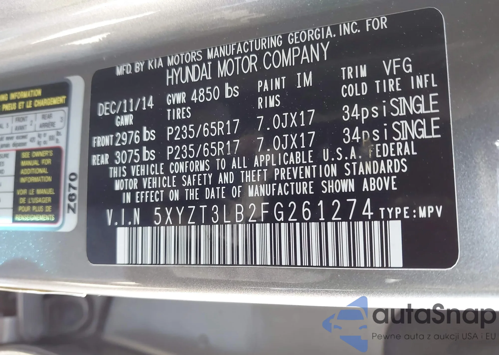 • VIN 5XYZT3LB2FG261274