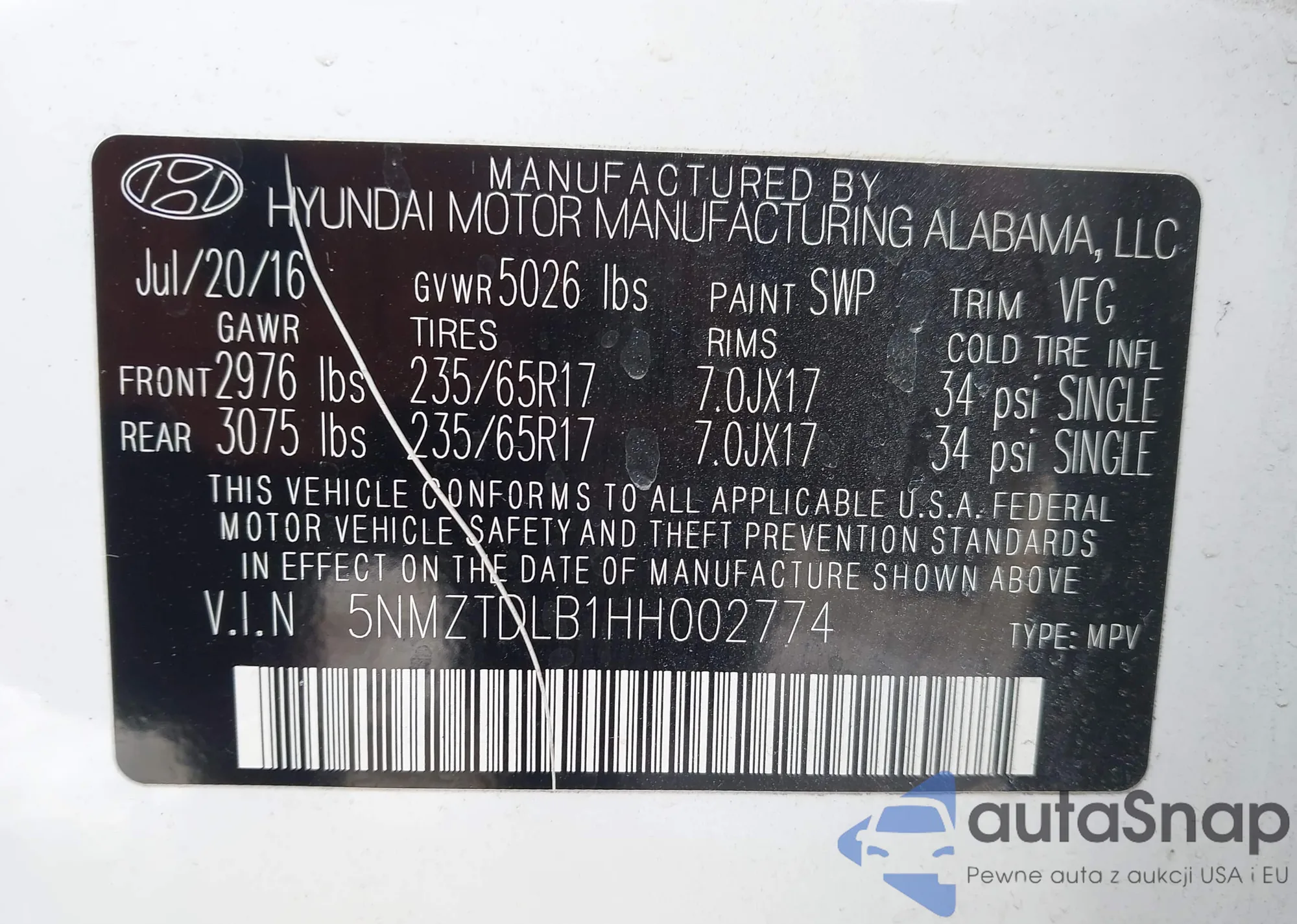 • VIN 5NMZTDLB1HH002774