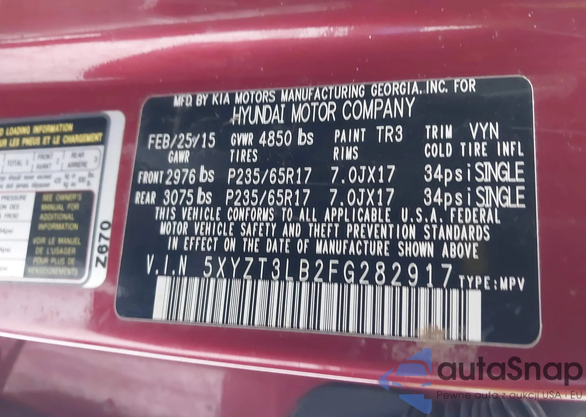 • VIN 5XYZT3LB2FG282917