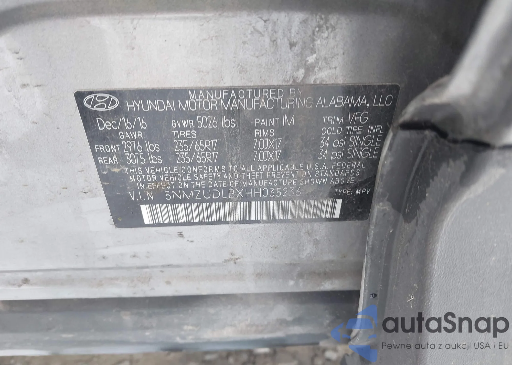 • VIN 5NMZUDLBXHH035236