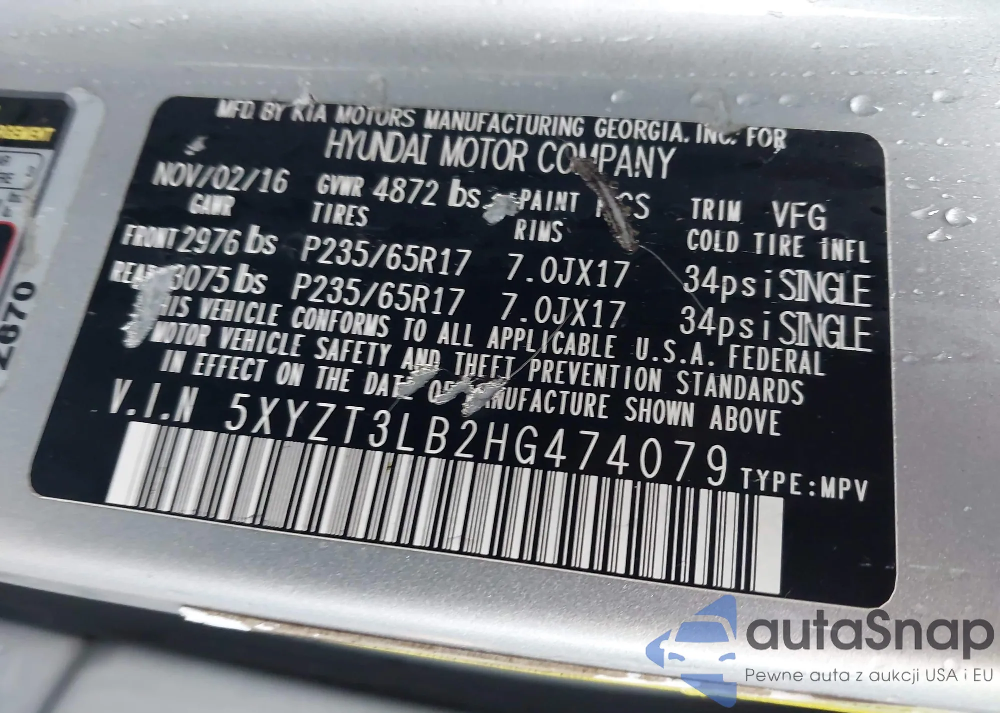• VIN 5XYZT3LB2HG474079