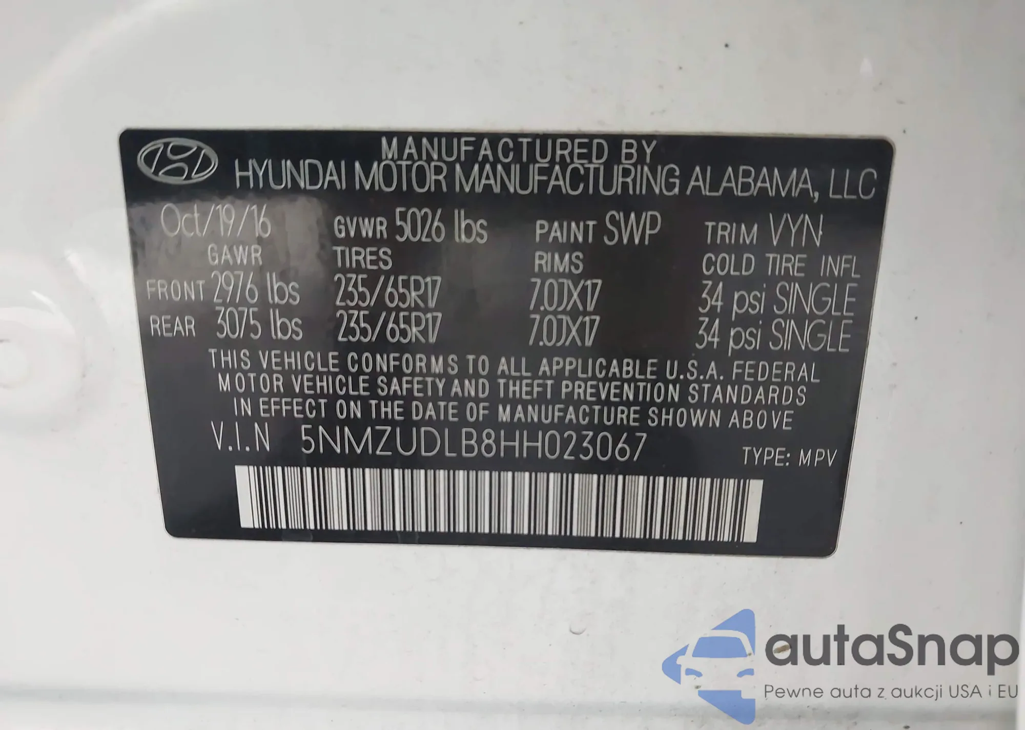 • VIN 5NMZUDLB8HH023067