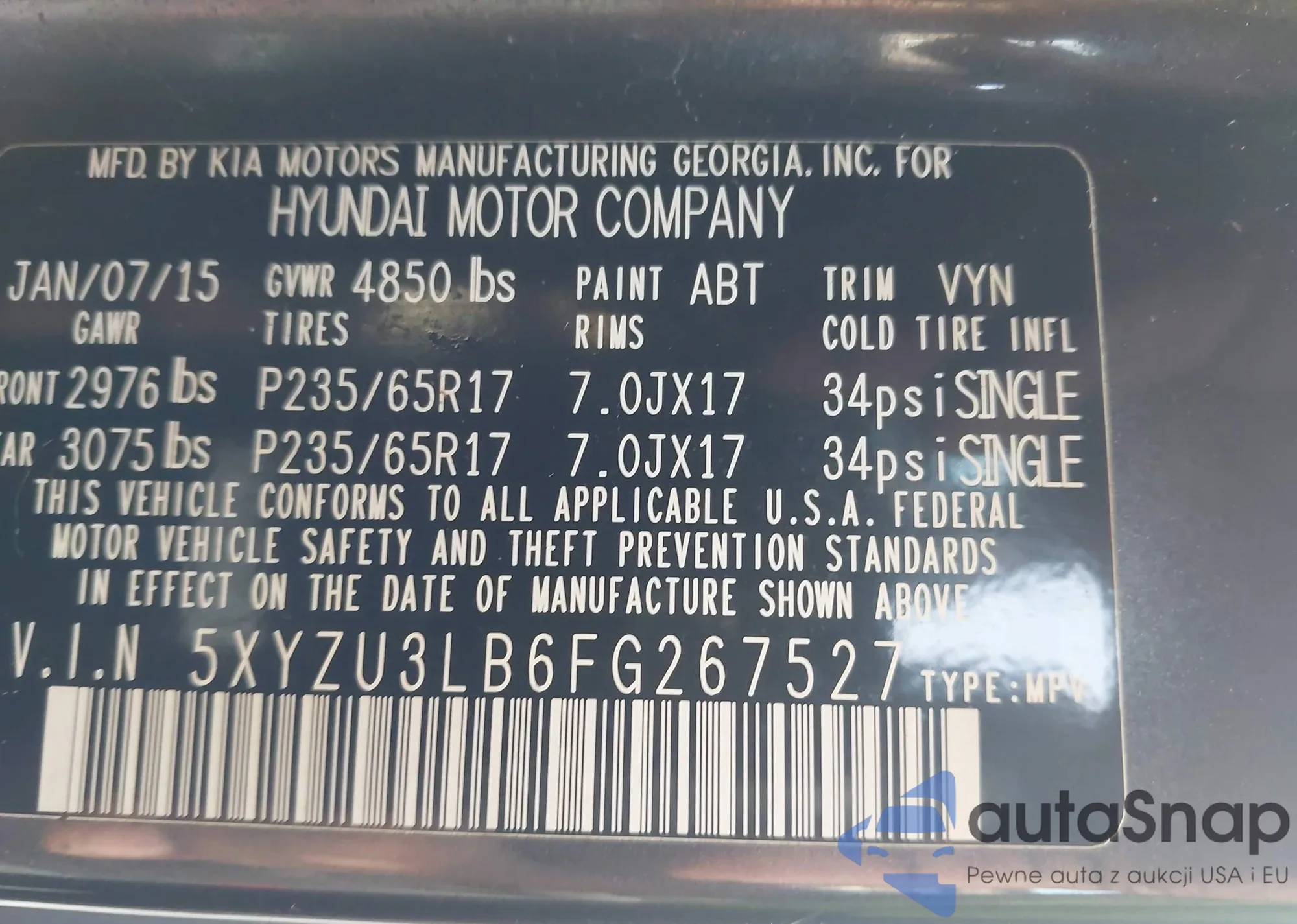 • VIN 5XYZU3LB6FG267527