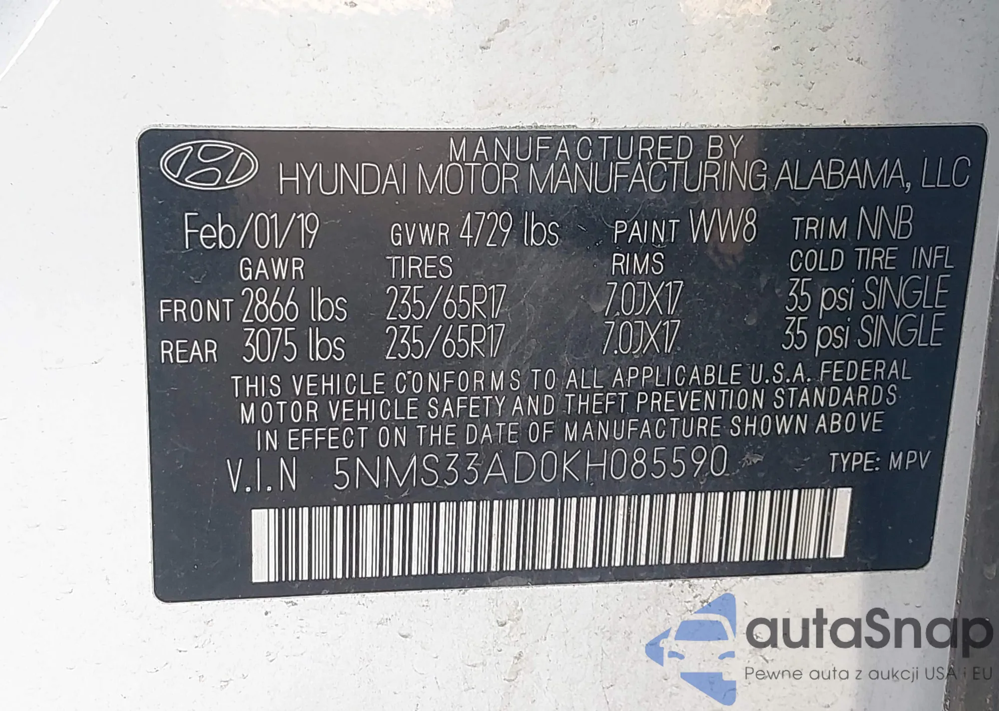• VIN 5NMS33AD0KH085590