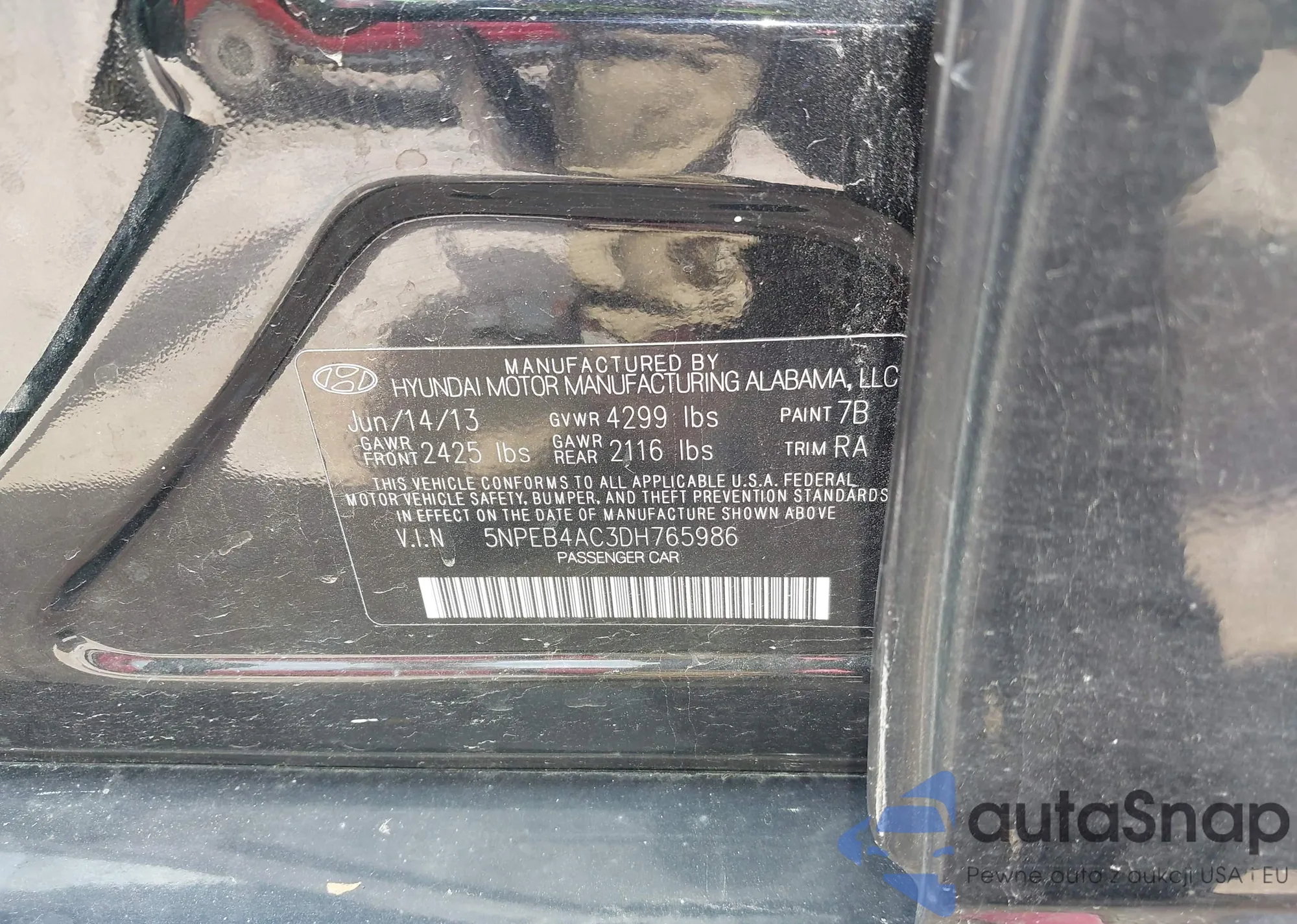 LOT: 42018551 VIN: 5NPEB4AC3DH765986