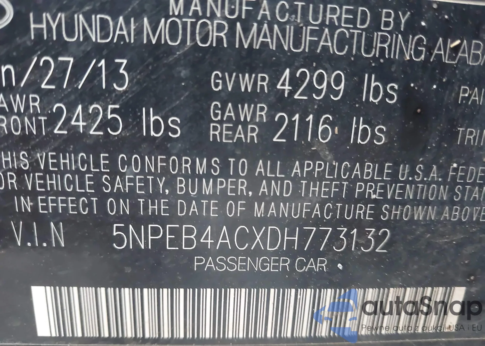 • VIN 5NPEB4ACXDH773132