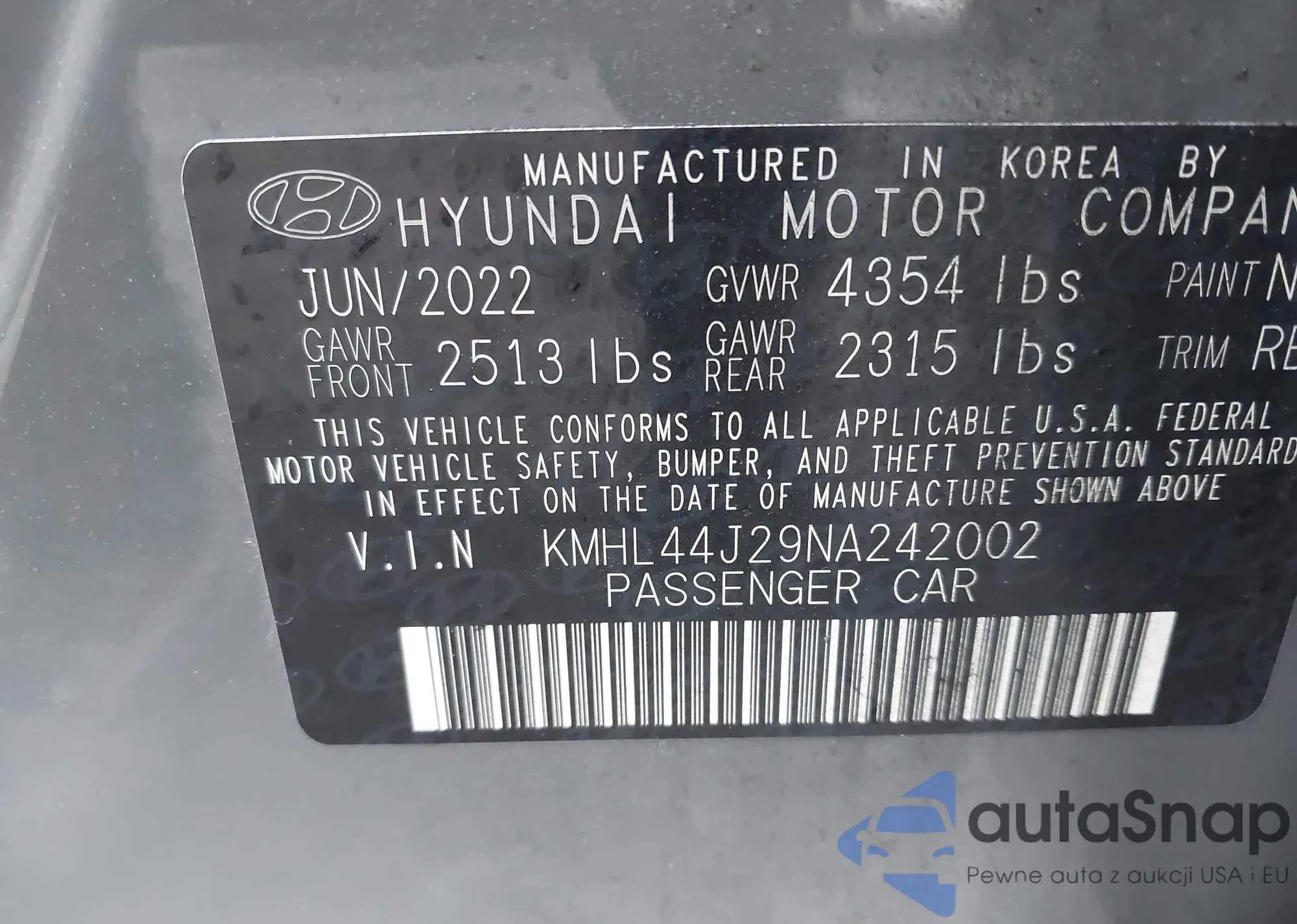 LOT: 44029448 VIN: KMHL44J29NA242002
