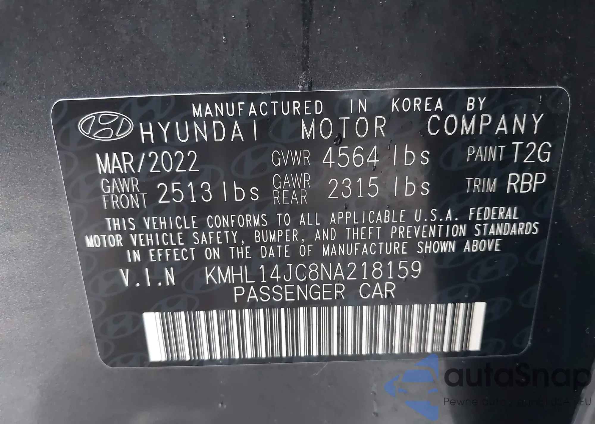 • VIN KMHL14JC8NA218159