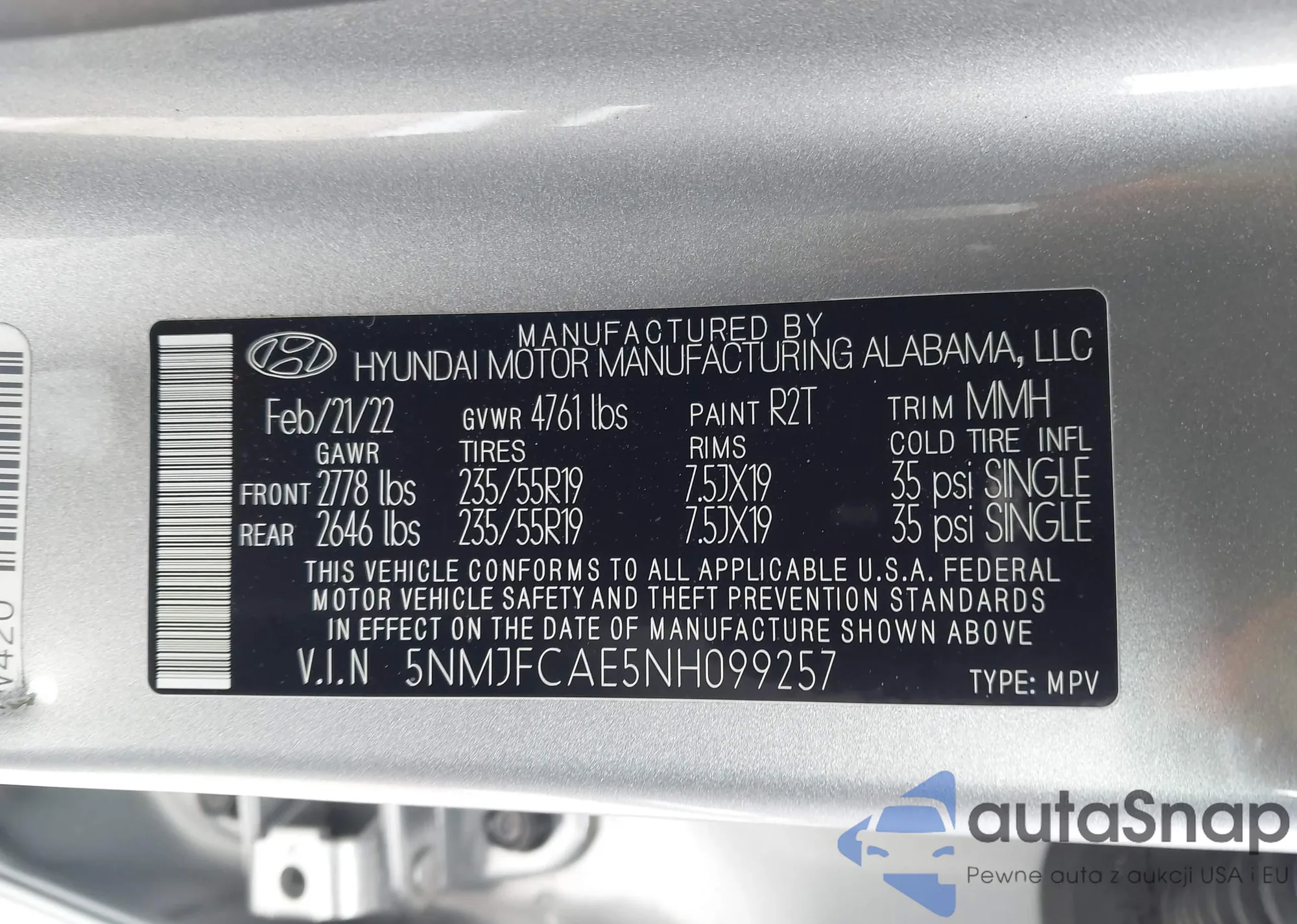 LOT: 44307647 VIN: 5NMJC3AE3NH042869