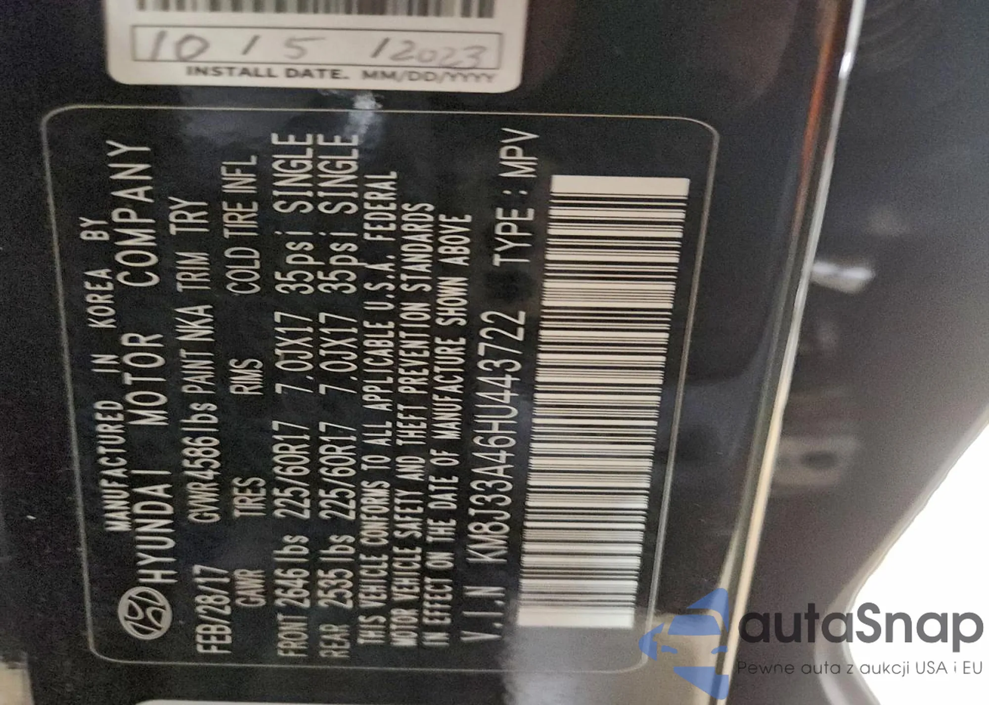 • VIN KM8J33A46HU443722
