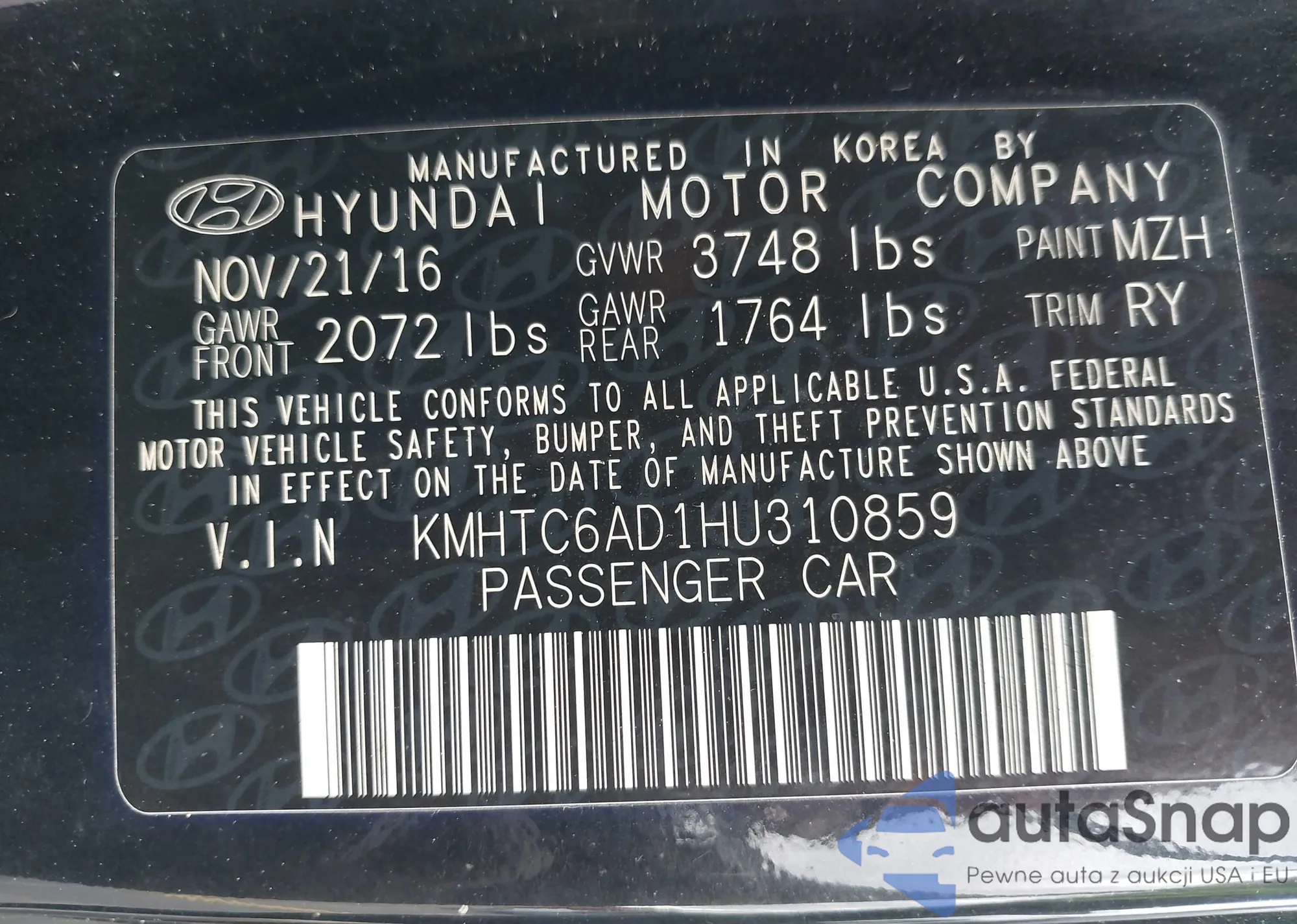 • VIN KMHTC6AD1HU310859
