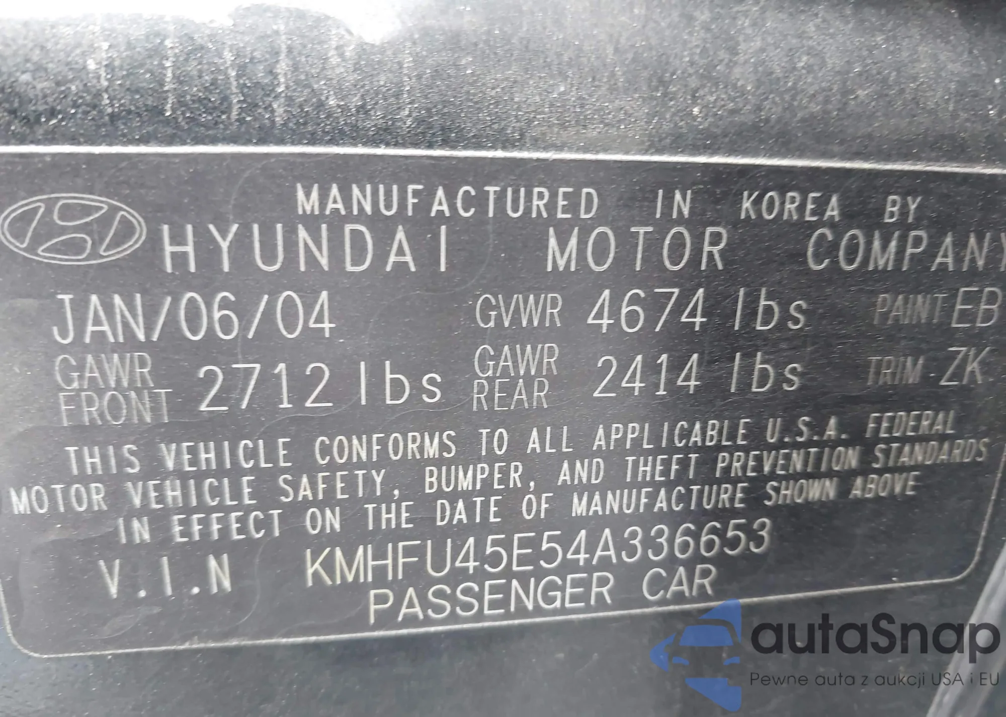 LOT: 44276763 VIN: KMHFU45E54A336653