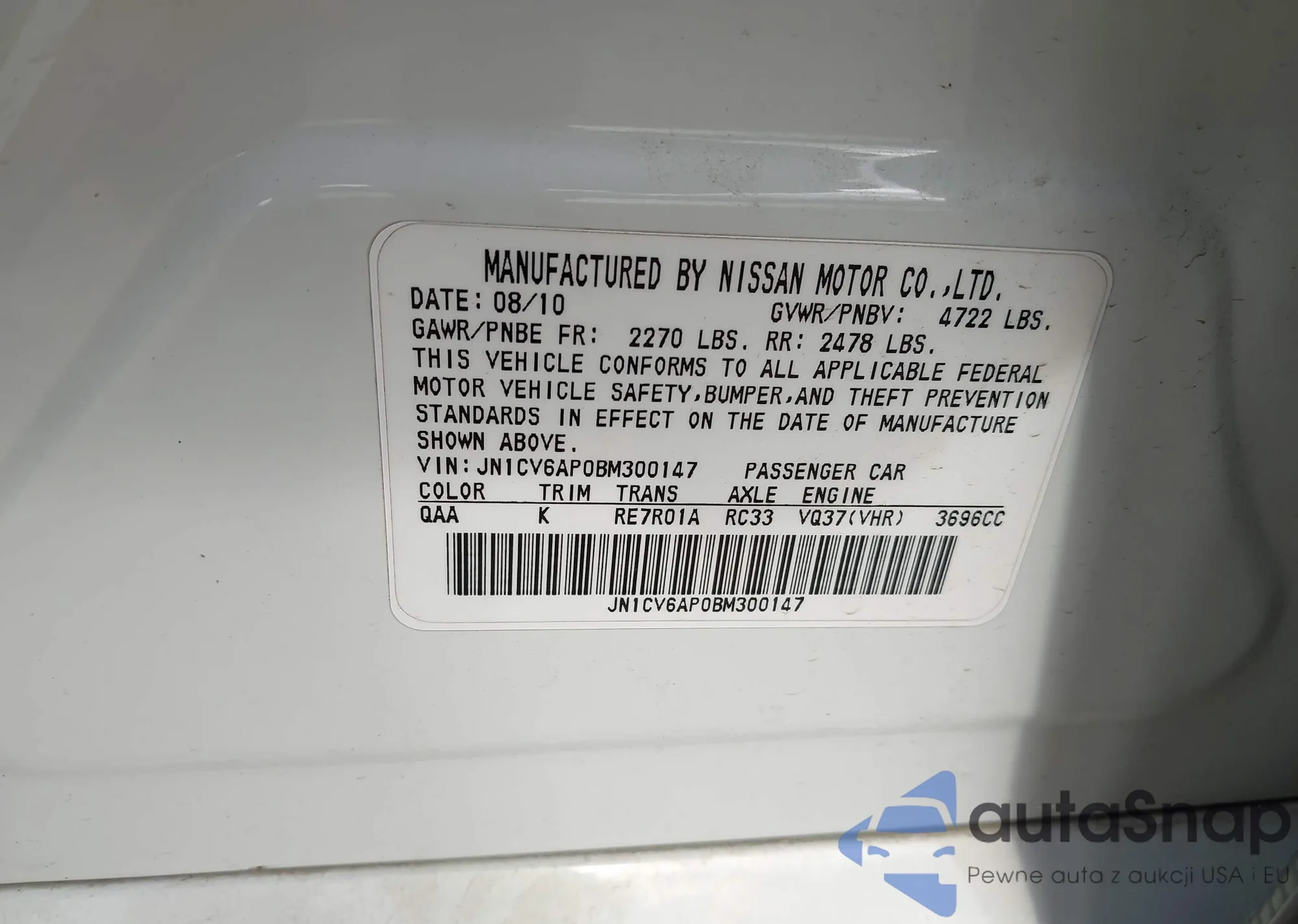 LOT: 44013664 VIN: JN1CV6AP0BM300147