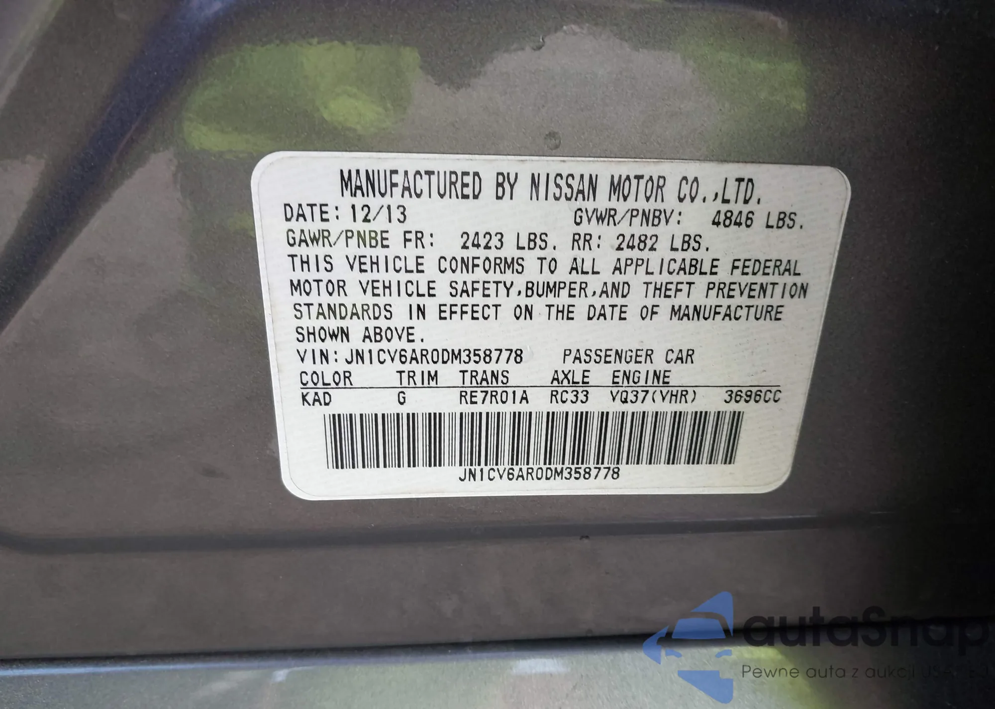 LOT: 44112630 VIN: JN1CV6AR0DM358778