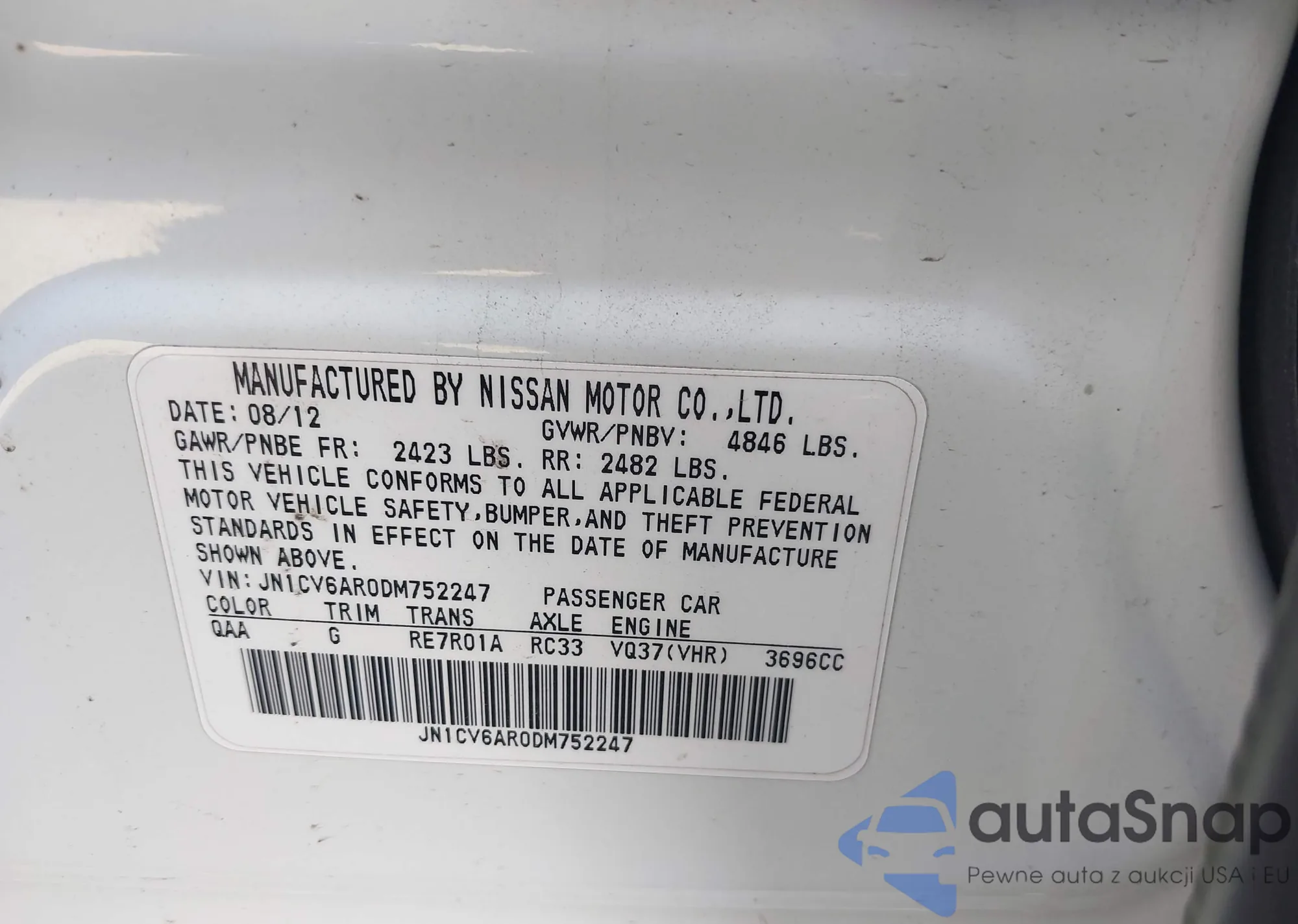 LOT: 44129601 VIN: JN1CV6AR0DM752247
