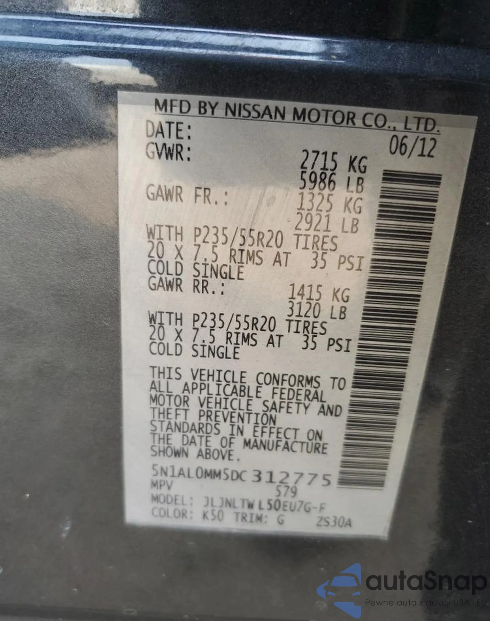 • VIN 5N1AL0MM5DC312775