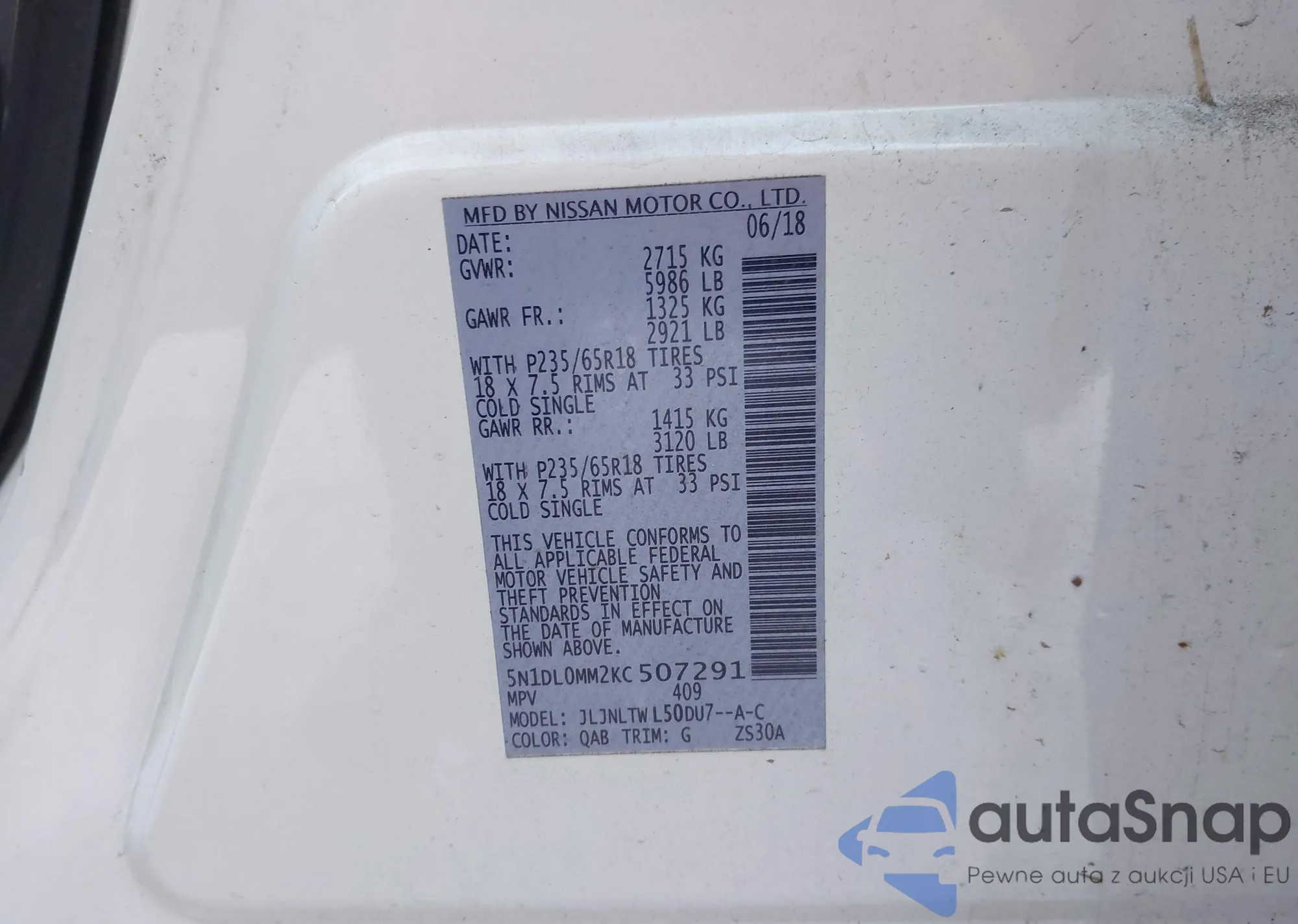 • VIN 5N1DL0MM2KC507291