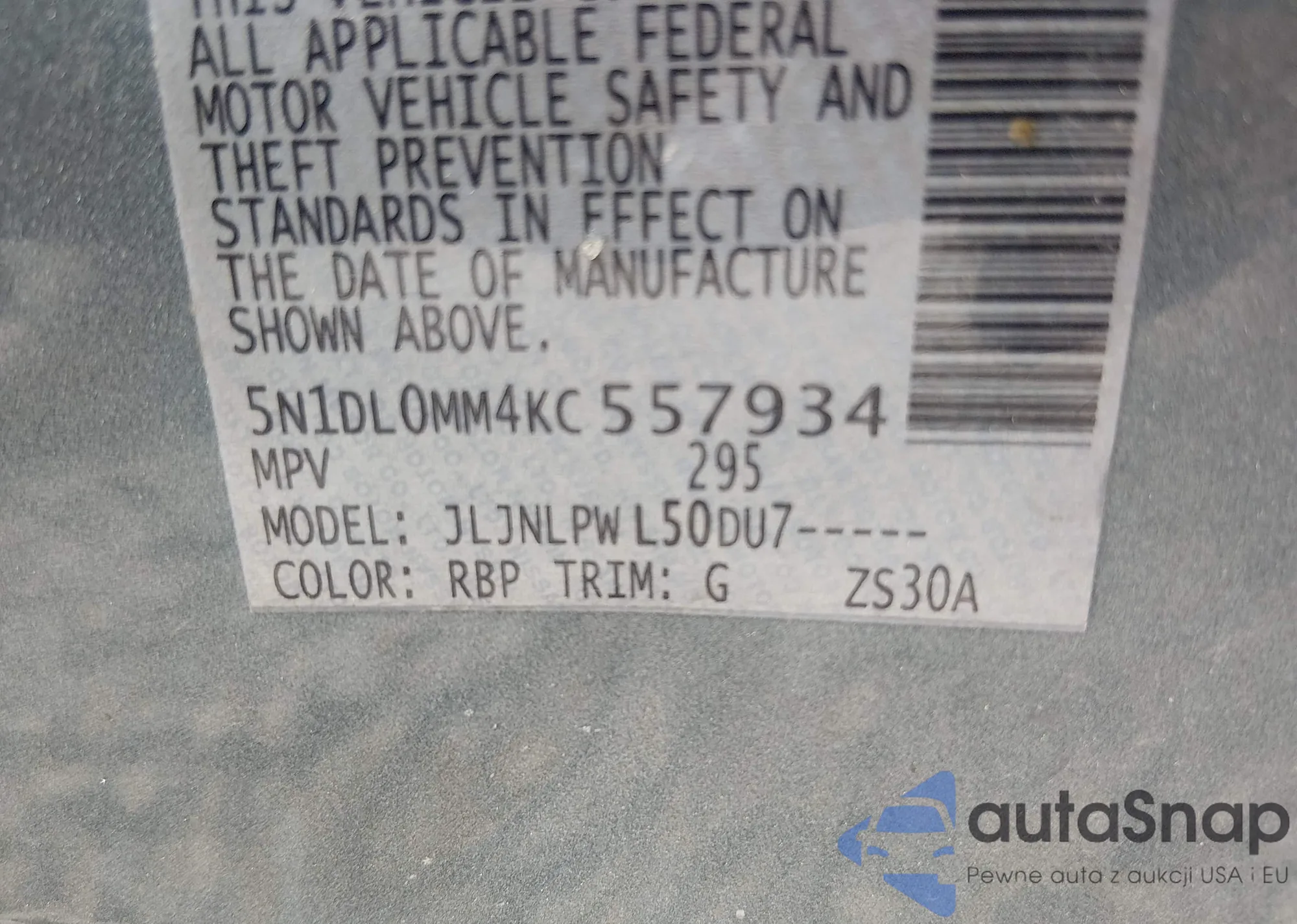 • VIN 5N1DL0MM4KC557934