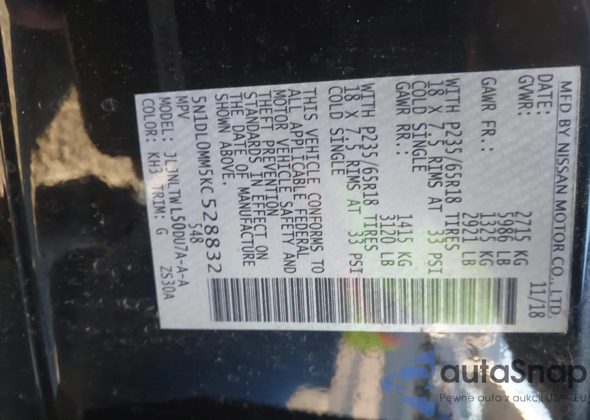 • VIN 5N1DL0MM5KC528832