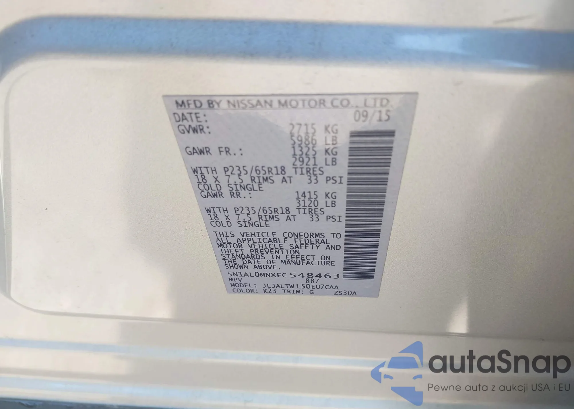 LOT: 43399427 VIN: 5N1AL0MNXFC548463