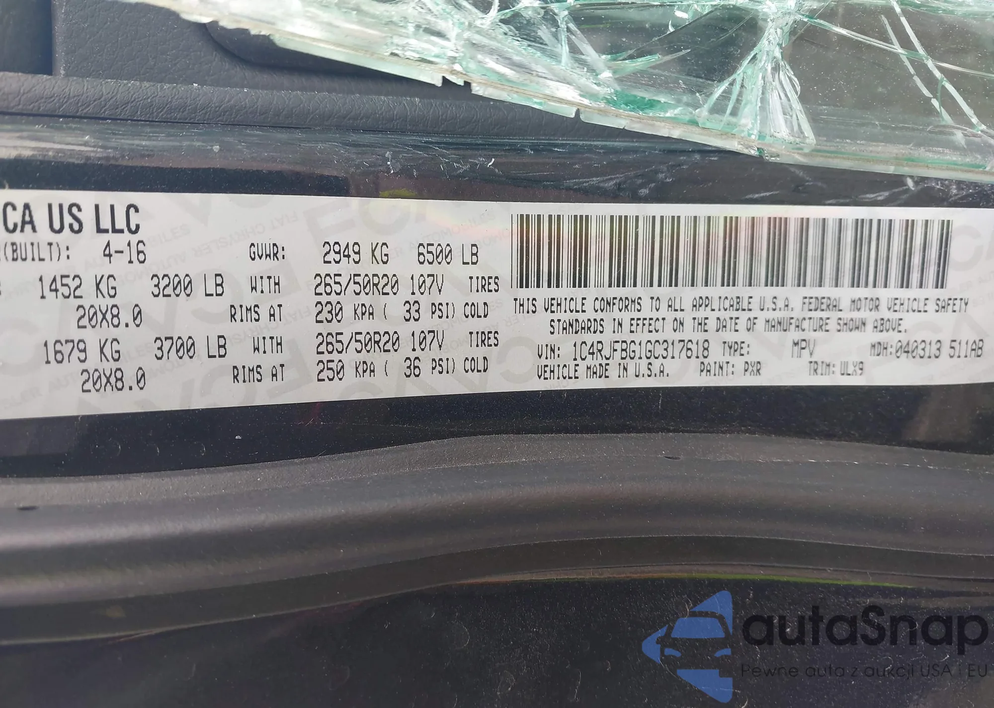 LOT: 43276016 VIN: 1C4RJFBG1GC317618
