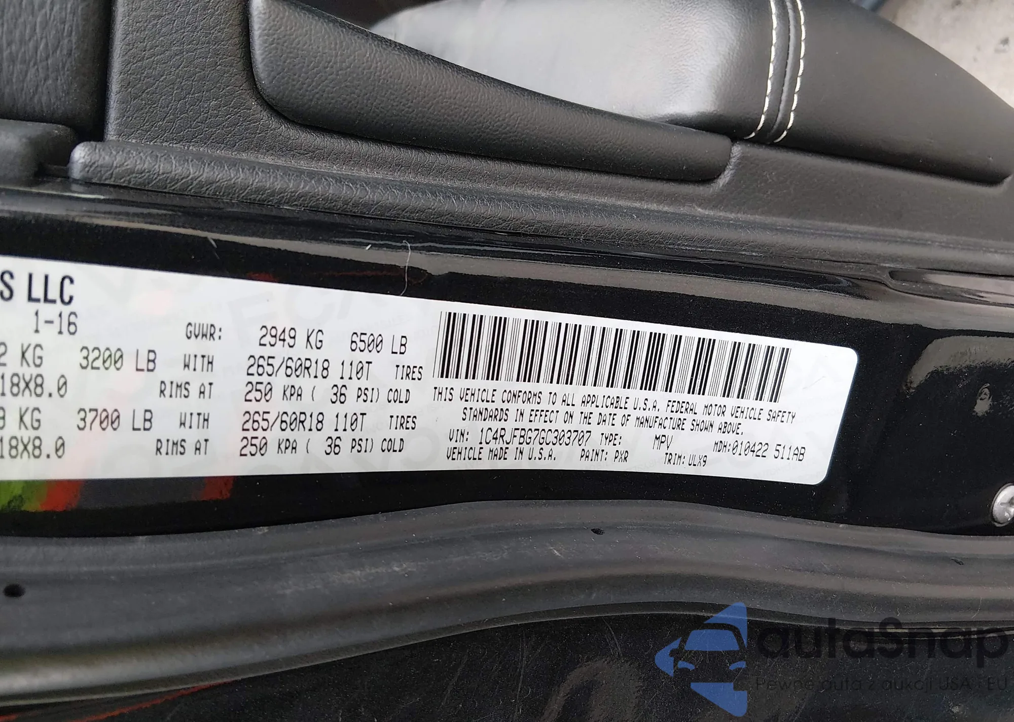 • VIN 1C4RJFBG7GC303707
