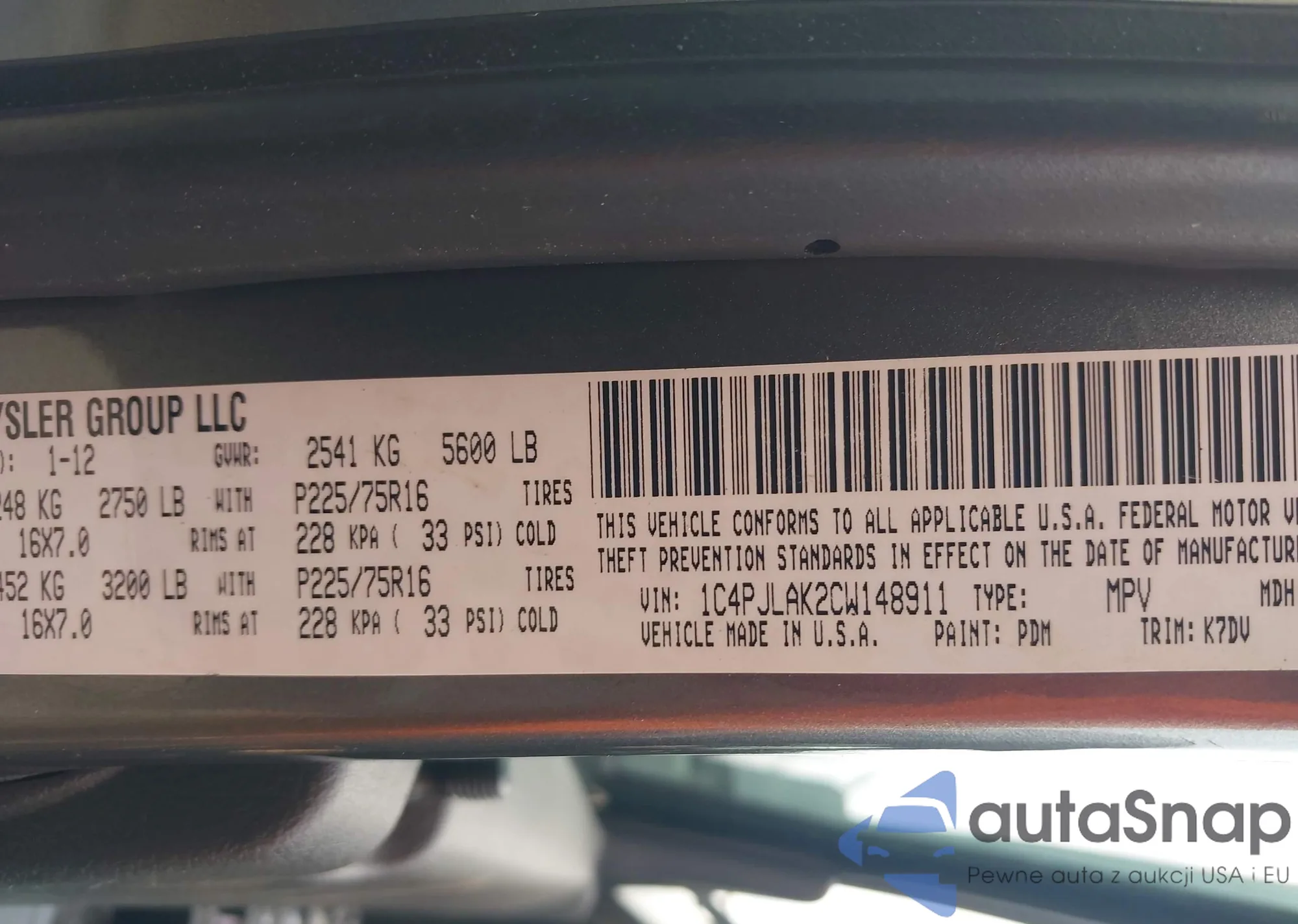 LOT: 44361432 VIN: 1C4PJLAK2CW148911