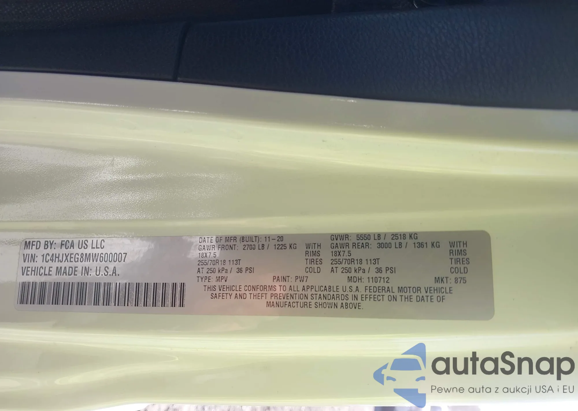 LOT: 44163618 VIN: 1C4HJXEG8MW600007