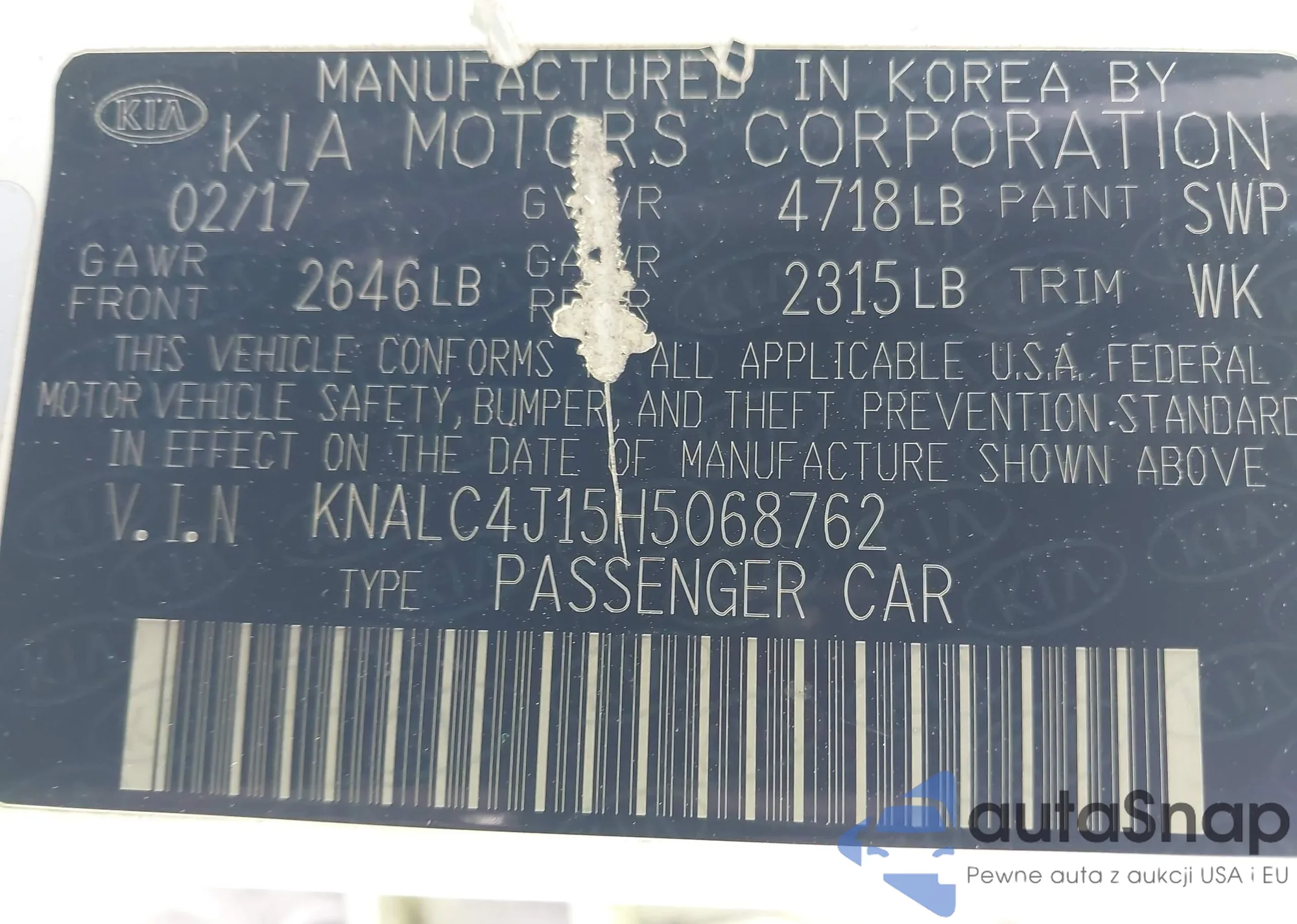 LOT: 44615069 VIN: KNALC4J17H5068410