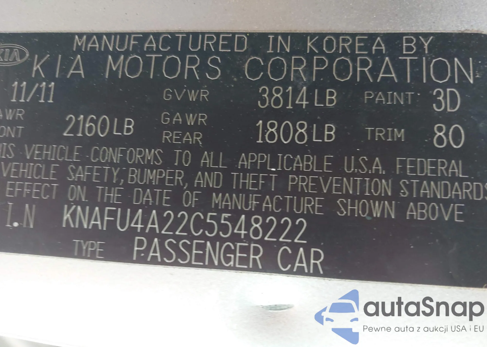 LOT: 42902460 VIN: KNAFU4A22C5543229