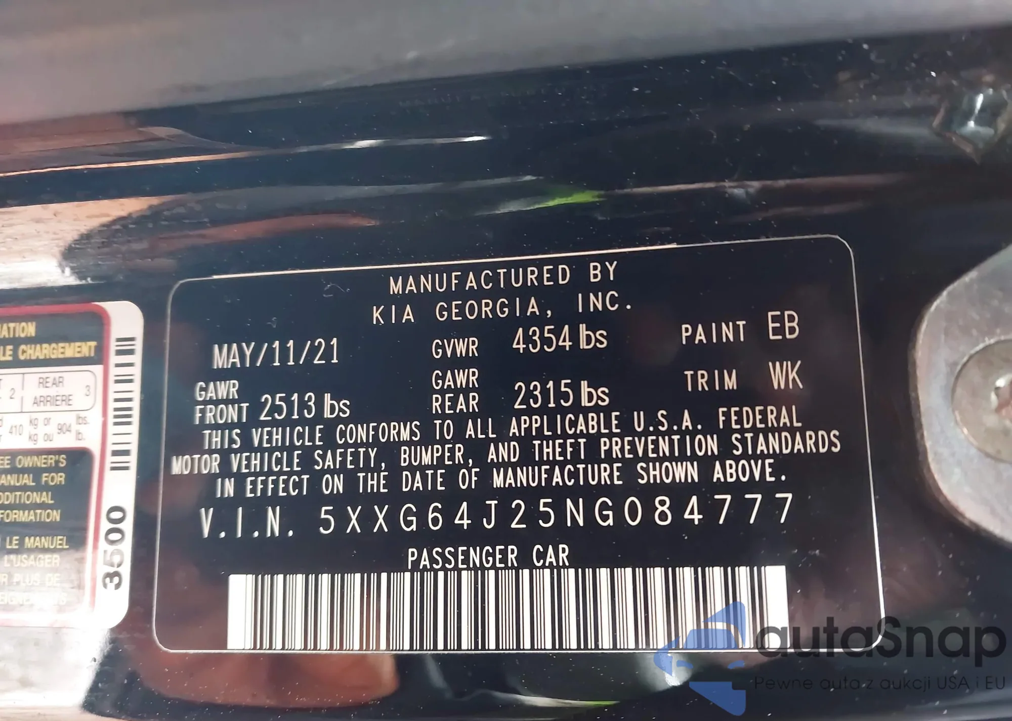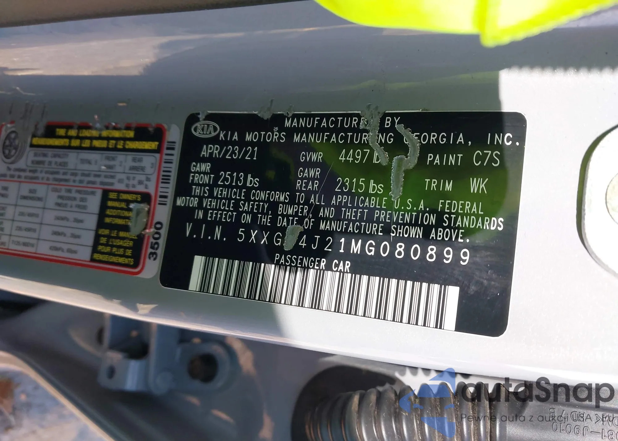 LOT: 44316029 VIN: 5XXG34J27MG003754
