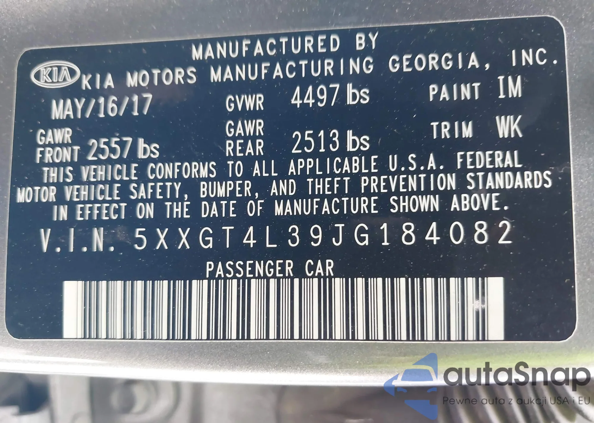 LOT: 39230385 VIN: 5XXGT4L39JG184082
