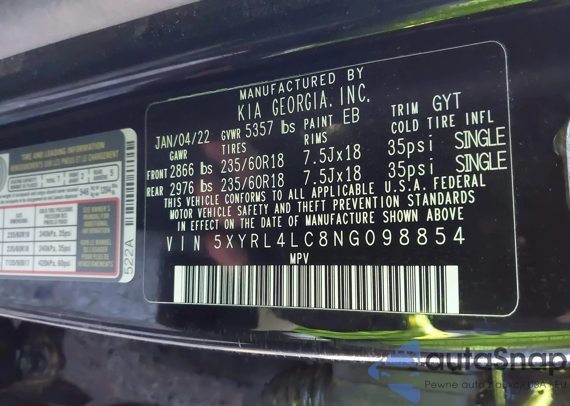 • VIN 5XYRL4LC8NG098854