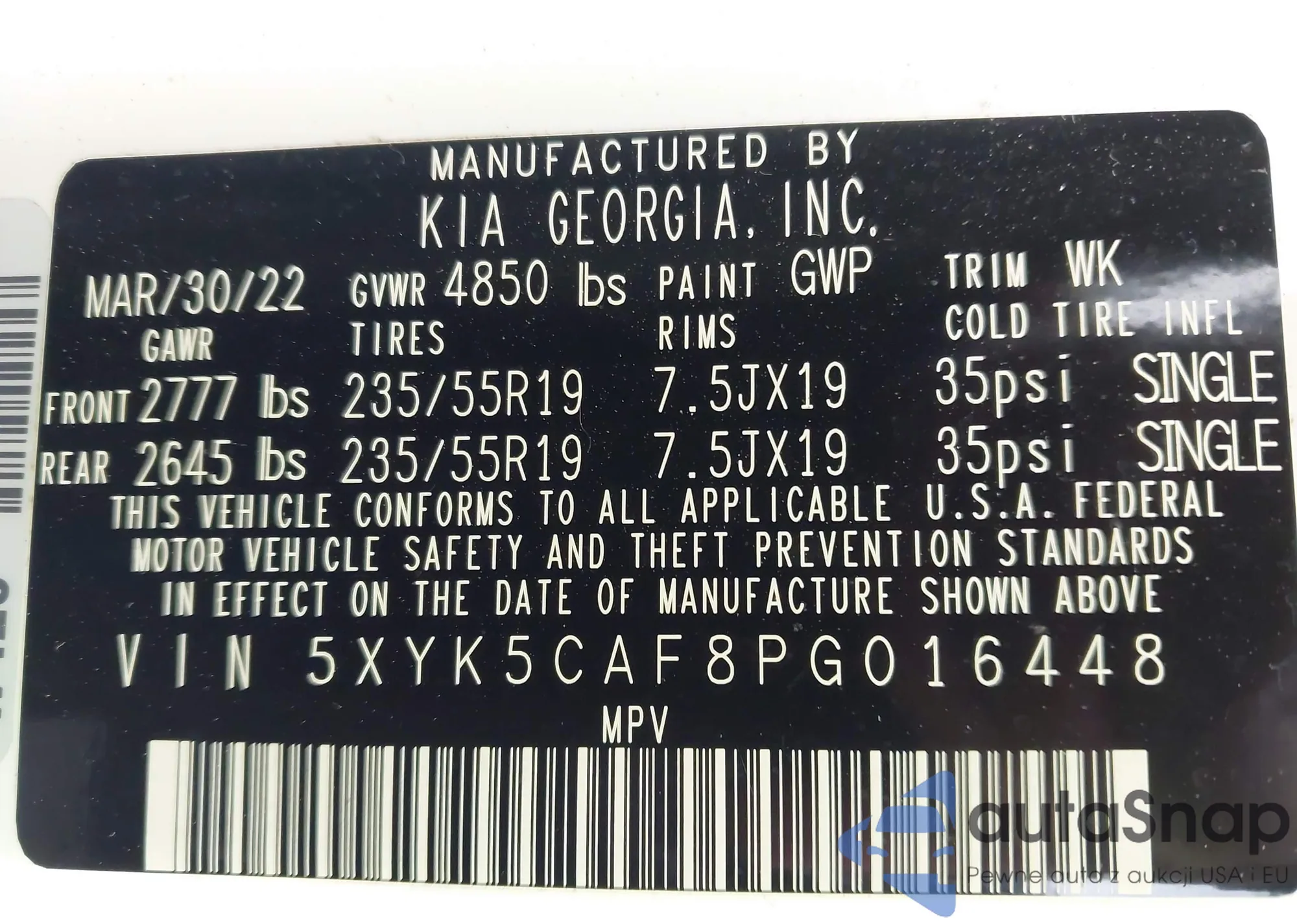 • VIN 5XYK5CAF8PG016448