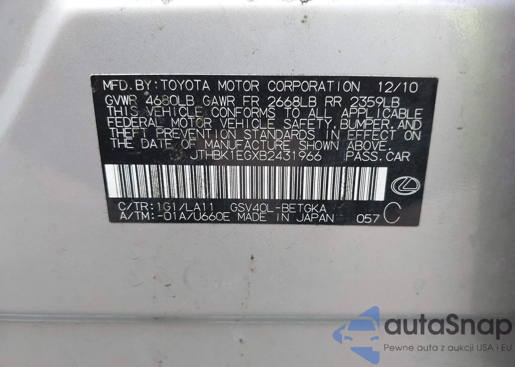 LOT: 44013264 VIN: JTHBK1EGXB2431966