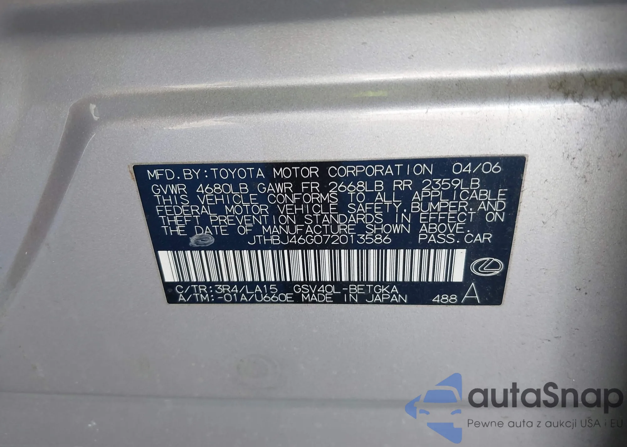 LOT: 44036864 VIN: JTHBJ46G072013586