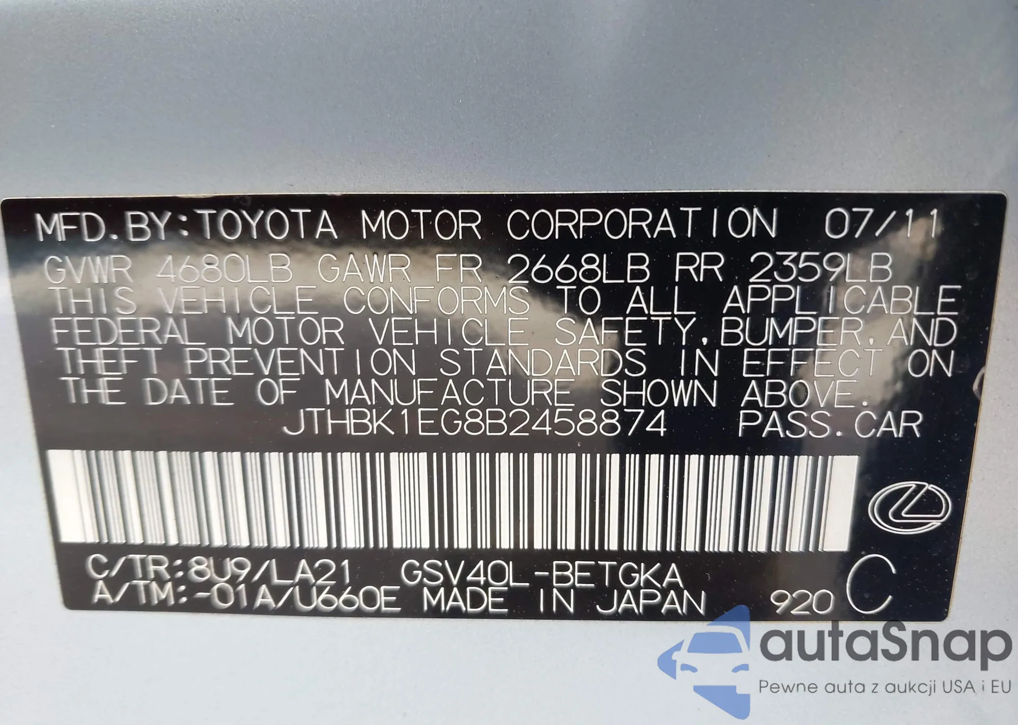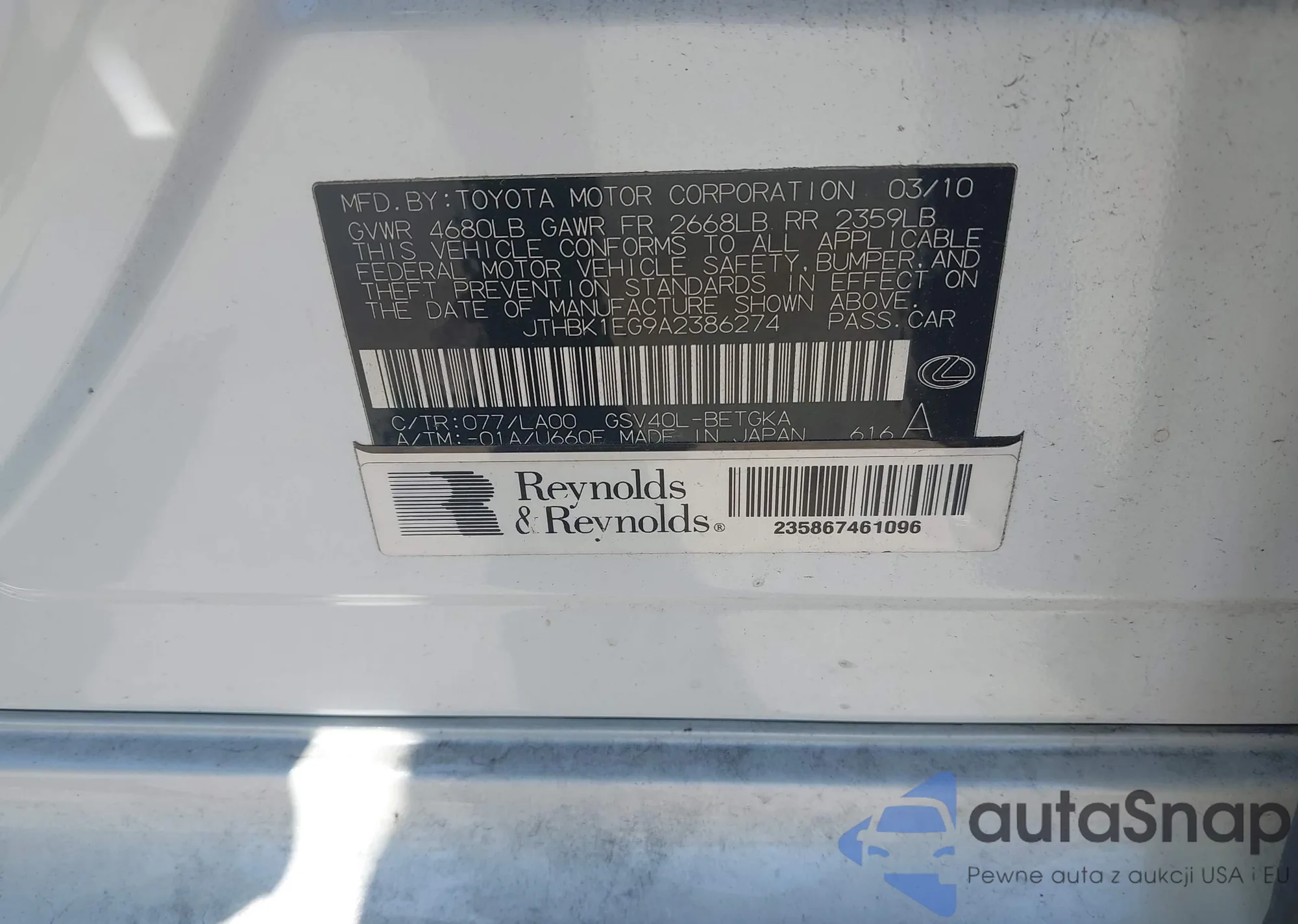 LOT: 44316668 VIN: JTHBJ46G182157276