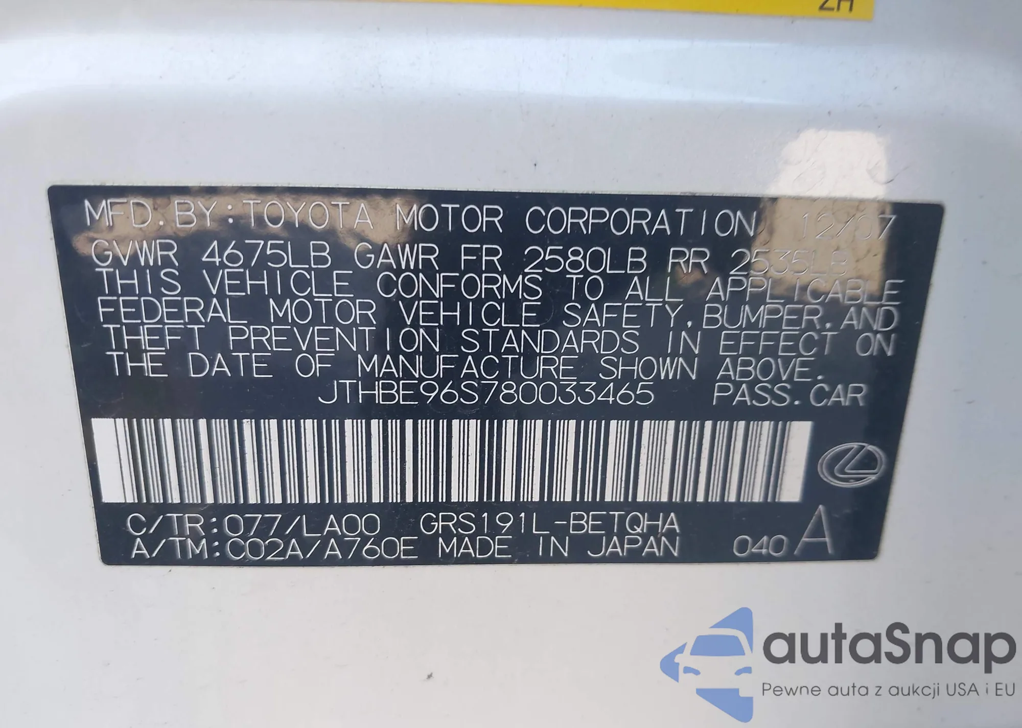 LOT: 43206681 VIN: JTHBE96S780033465