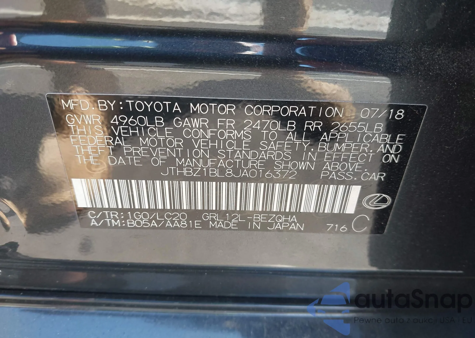 • VIN JTHBZ1BL8JA016372