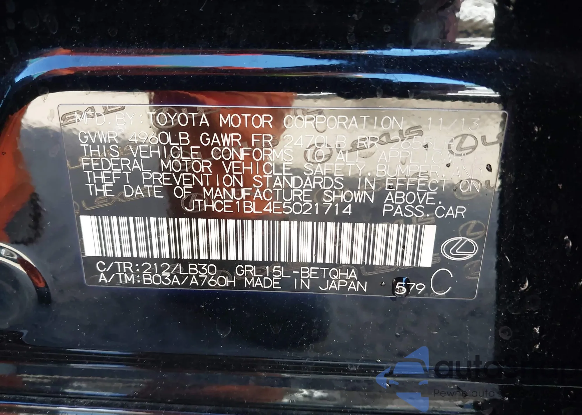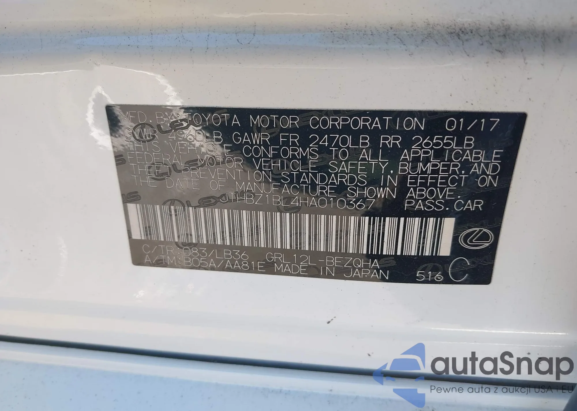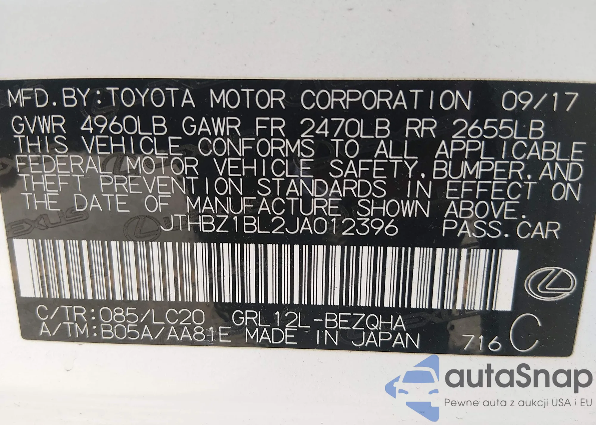 LOT: 43082535 VIN: JTHBZ1BL8JA016372