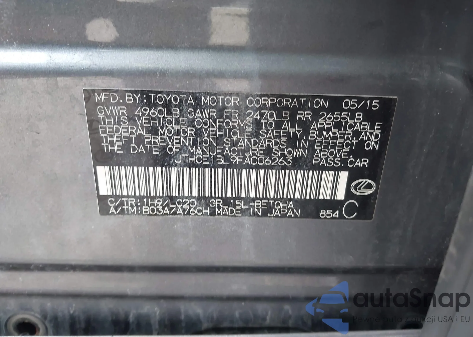 • VIN JTHCE1BL9FA006263