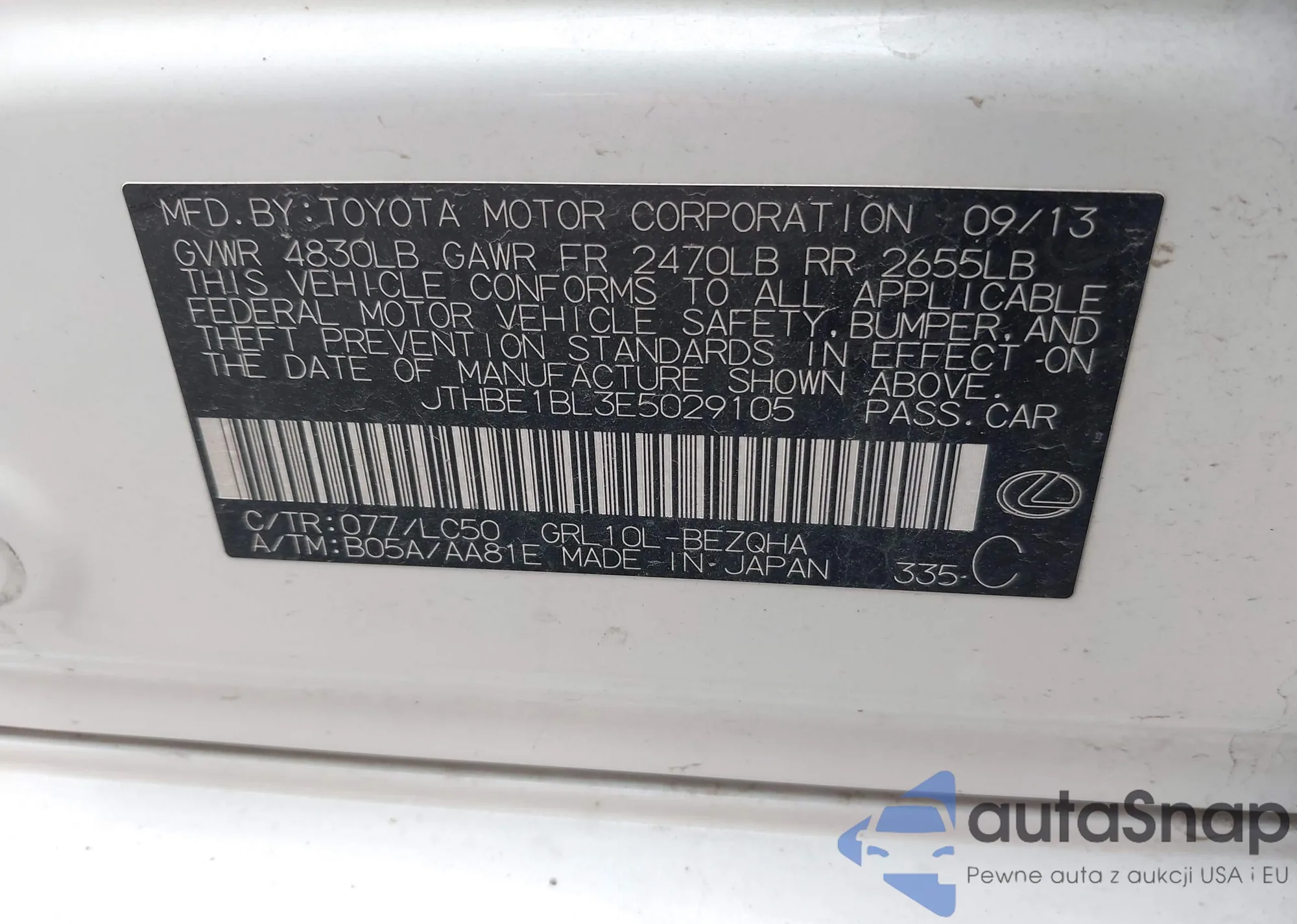 LOT: 84920425 VIN: JTHBE1BL4D5011016