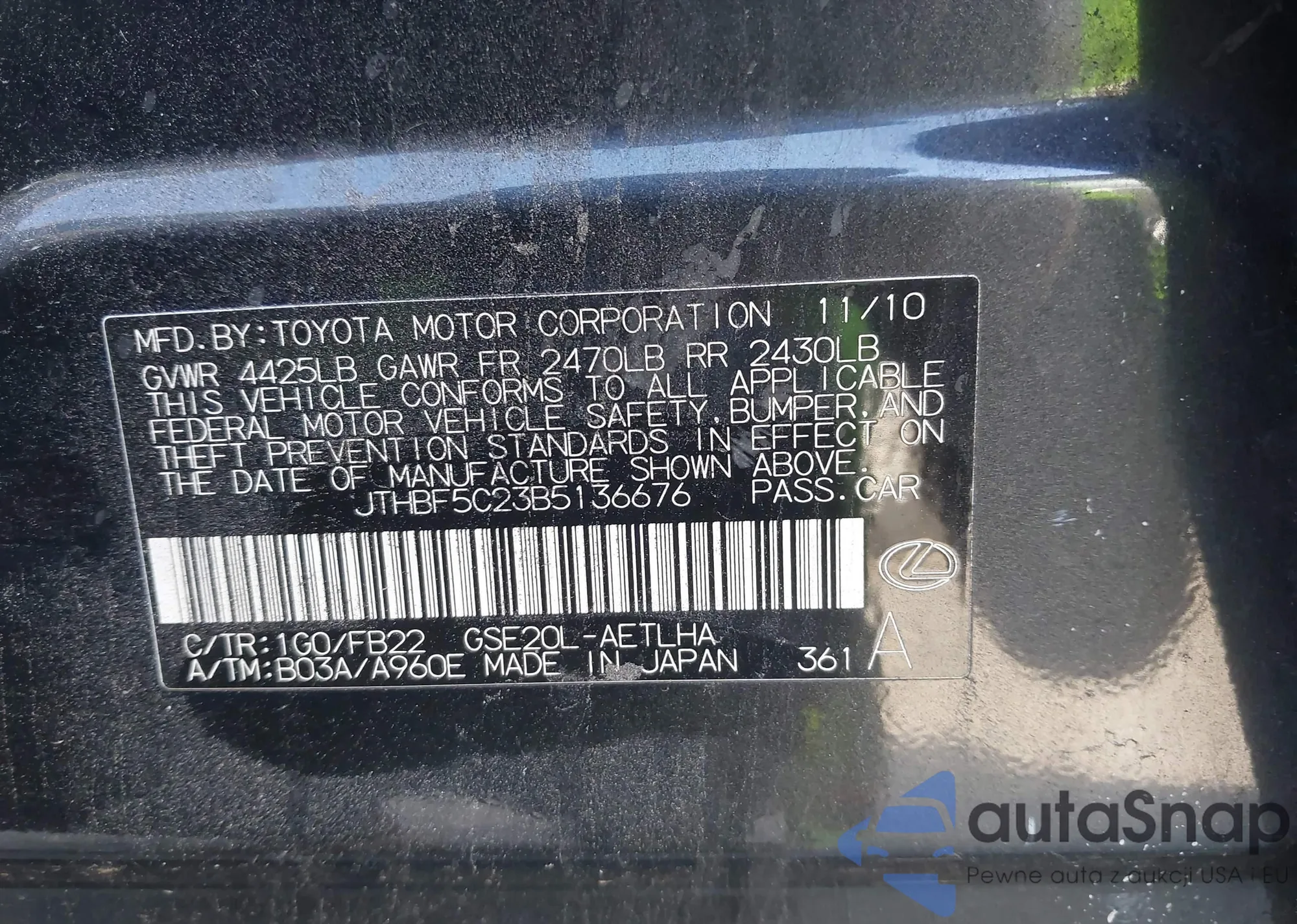 LOT: 44139981 VIN: JTHBF5C23B5136676
