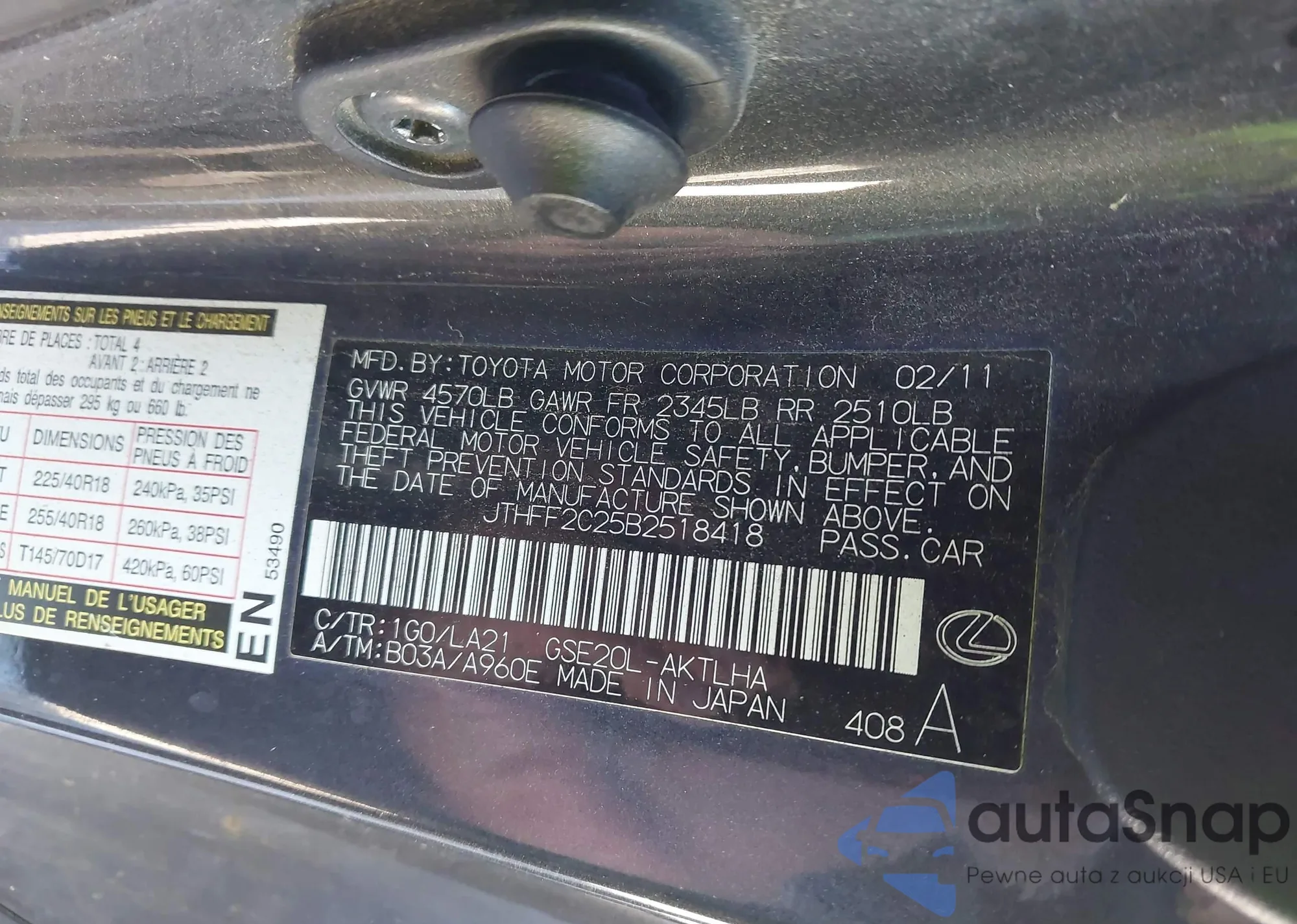LOT: 43762290 VIN: JTHFF2C25B2518418