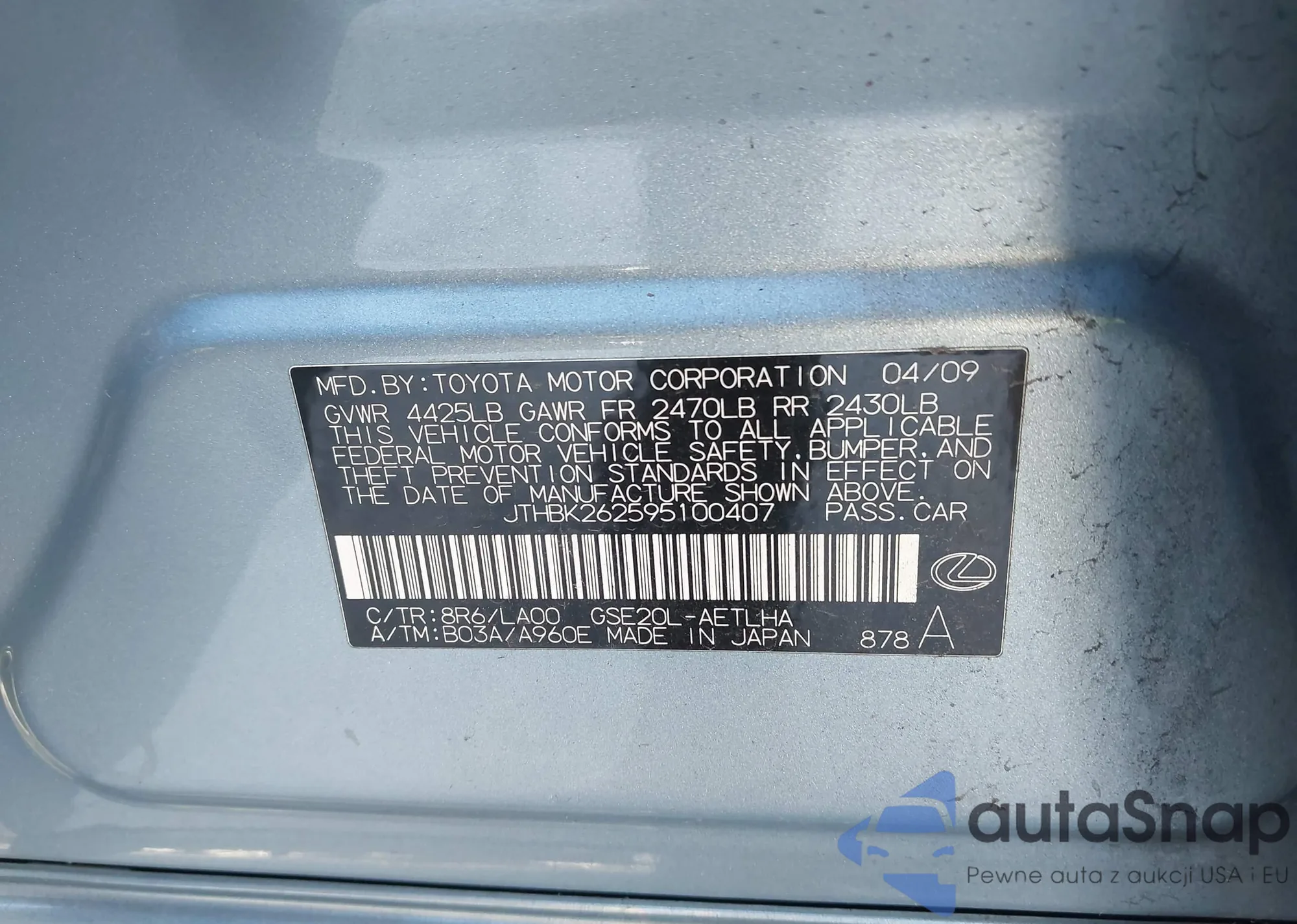 LOT: 68060735 VIN: JTHBK262395106674