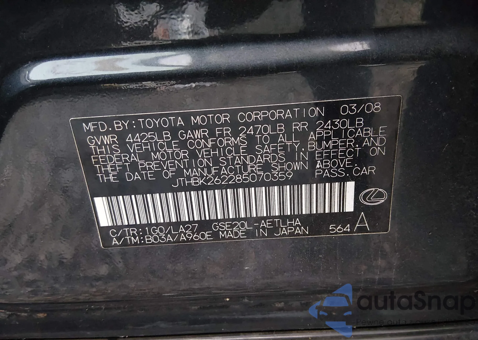 LOT: 44192890 VIN: JTHBK262185074032