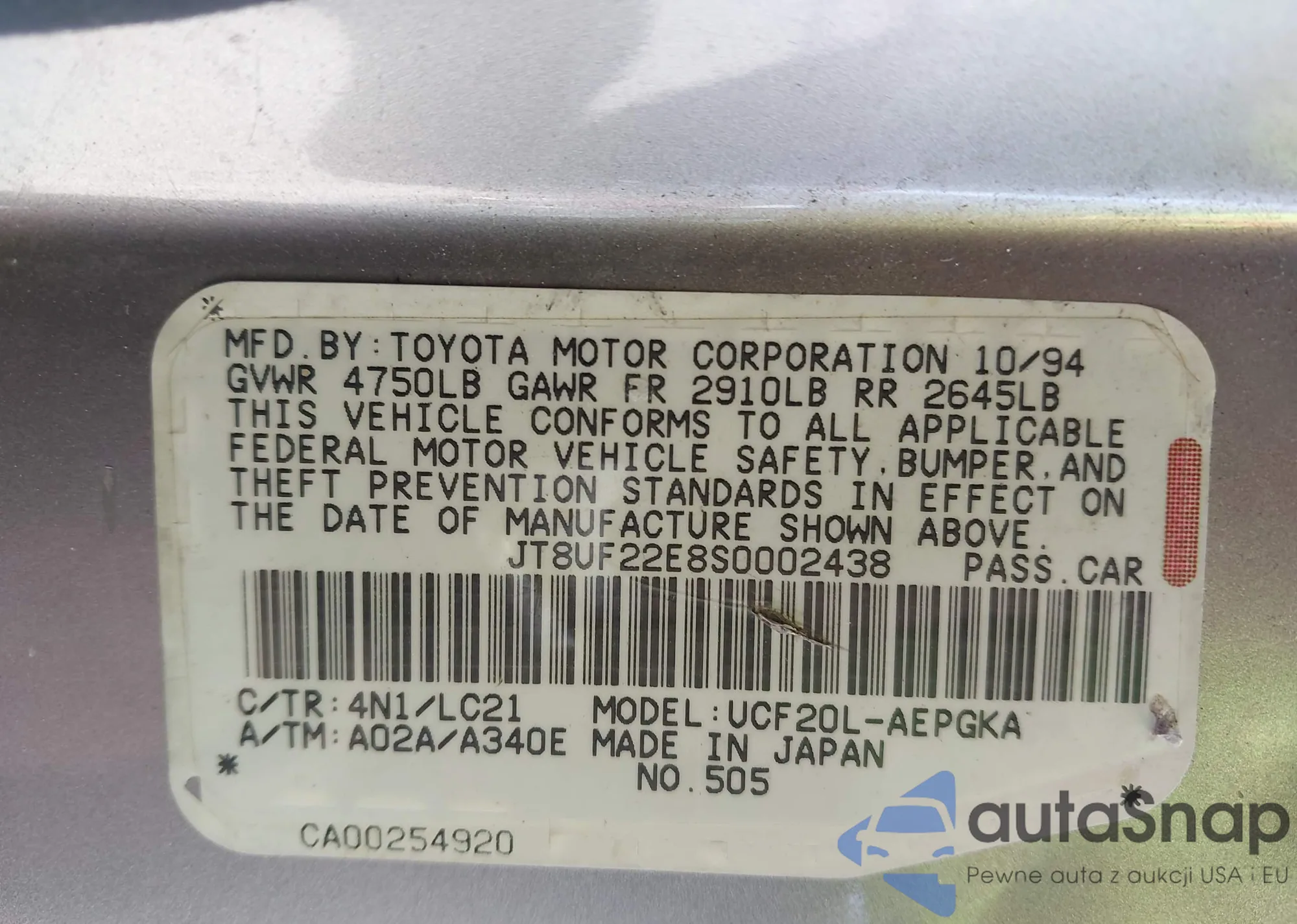 LOT: 44263208 VIN: JT8UF22E8S0002438
