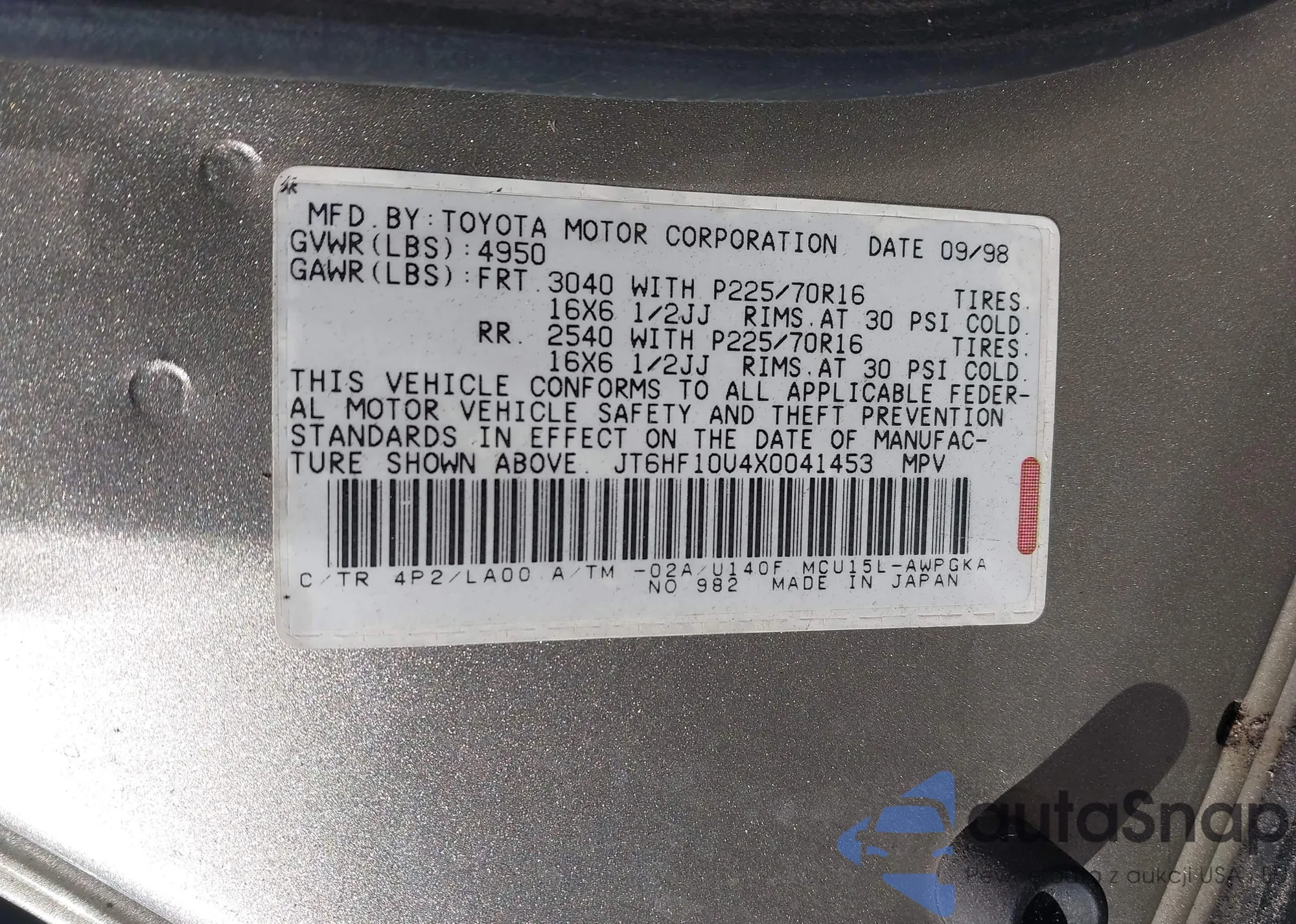 LOT: 44052198 VIN: JT6HF10U3X0045042