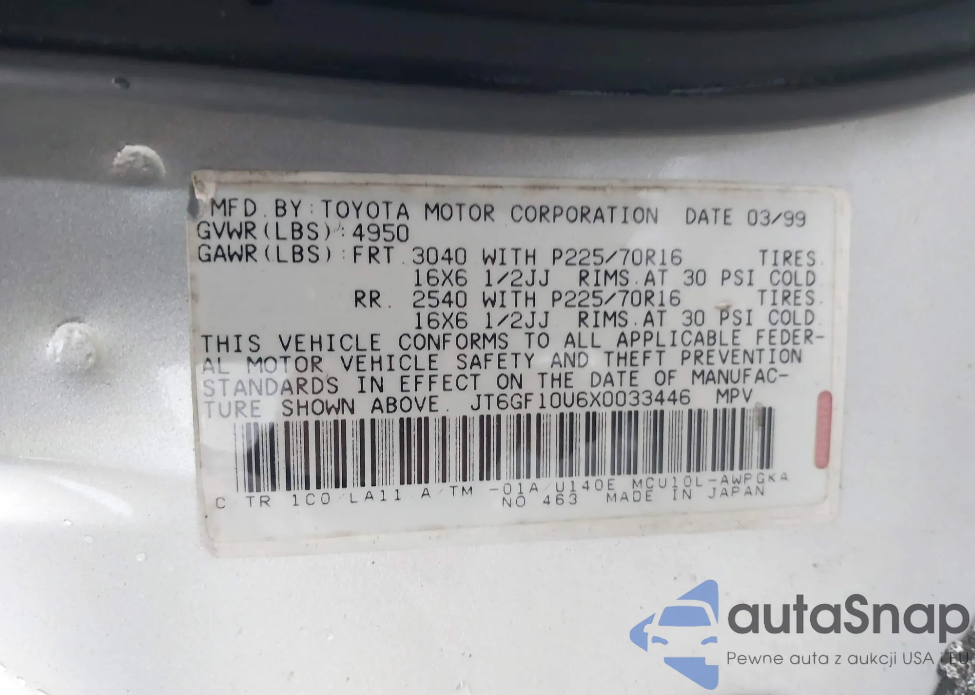 LOT: 44227761 VIN: JT6GF10U6X0033446