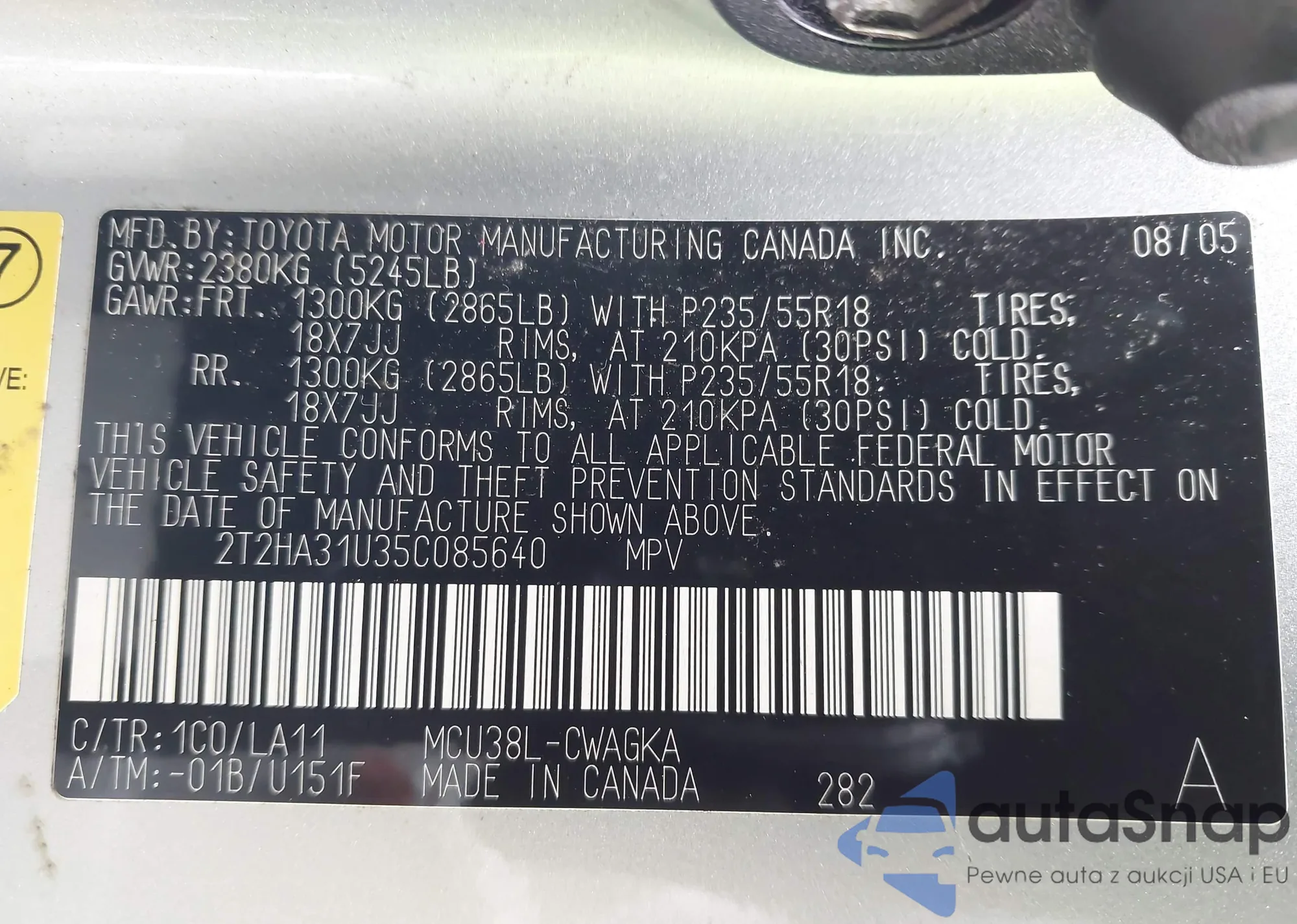 • VIN 2T2HA31U35C085640